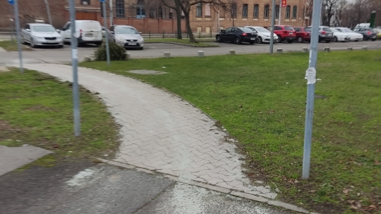 A térképen jelzett kerékpárút szakasz a csúszásgátló szóróanyag miatt csúszásveszélyes. Ironikus, de hónak vagy jégnek nyoma sincs, a finom szemcsés anyag viszont így többet árt mint használ.