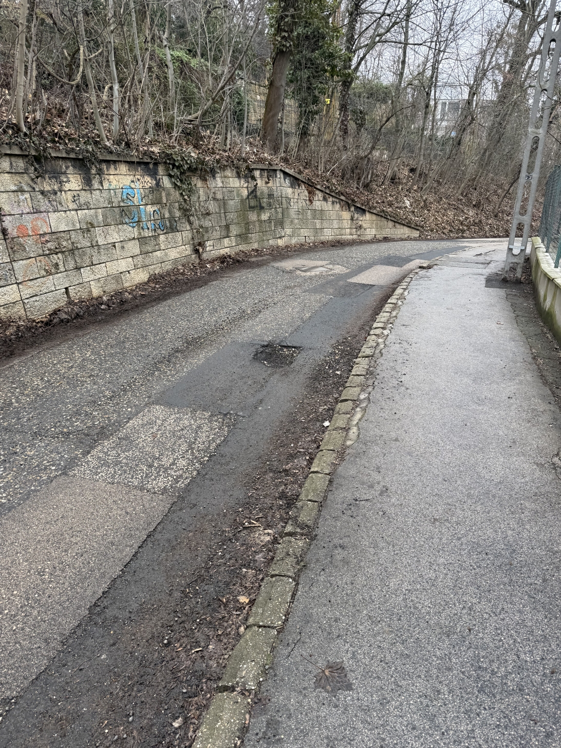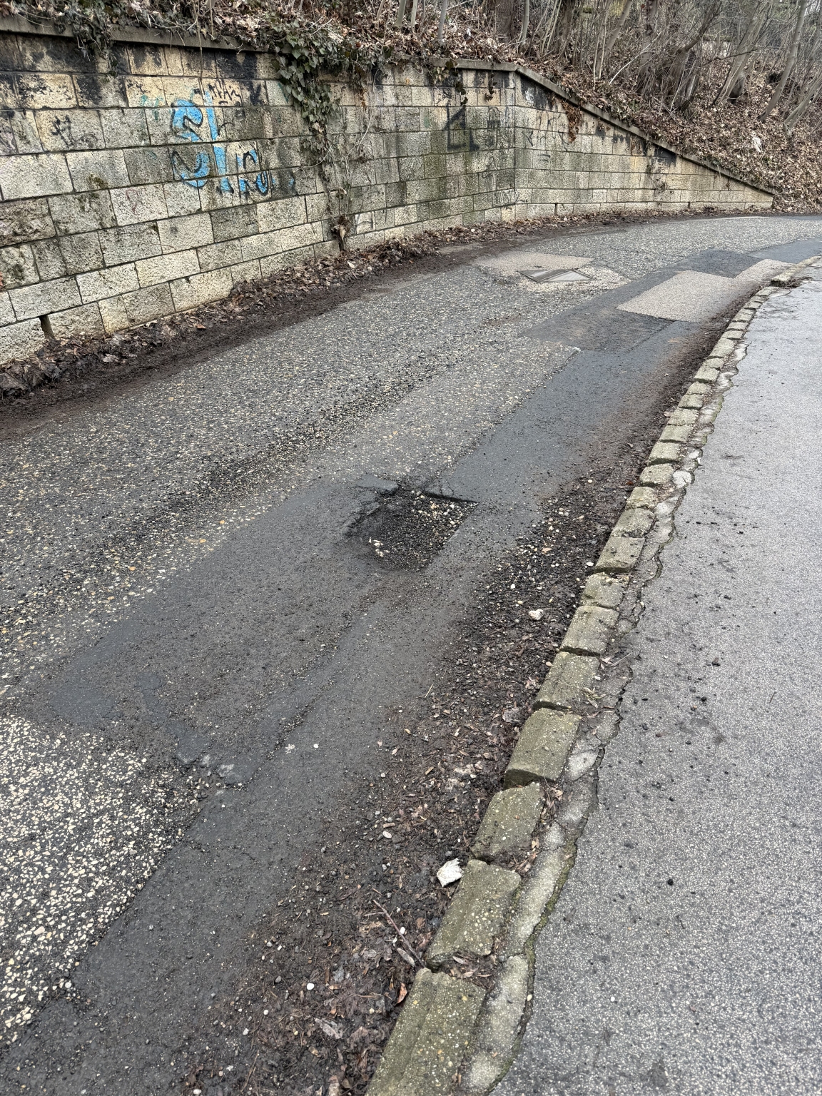 A jelölt helyen a Karthauzi úton - az út íve miatt - észrevehetetlen és kikerülhetetlen kátyú van, kérem javítani az utat. Köszönöm.