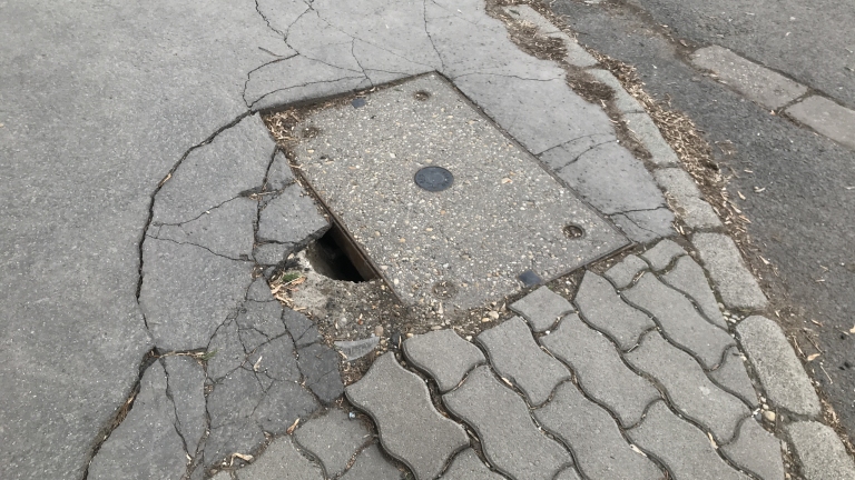 A XIII. kerületi Révész utca - Esztergomi utca sarkán súlyosan balesetveszélyes a közmű fedél melletti járda, mert bármikor beszakadhat! Máris elég nagy a fedél mellett a lyuk, körülötte pedig komoly repedések vannak.