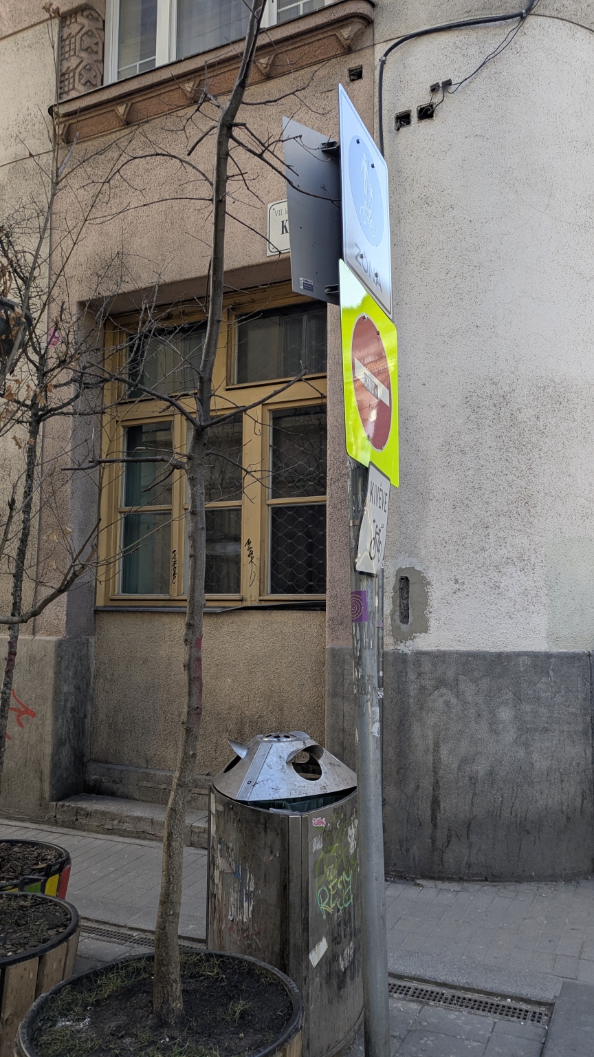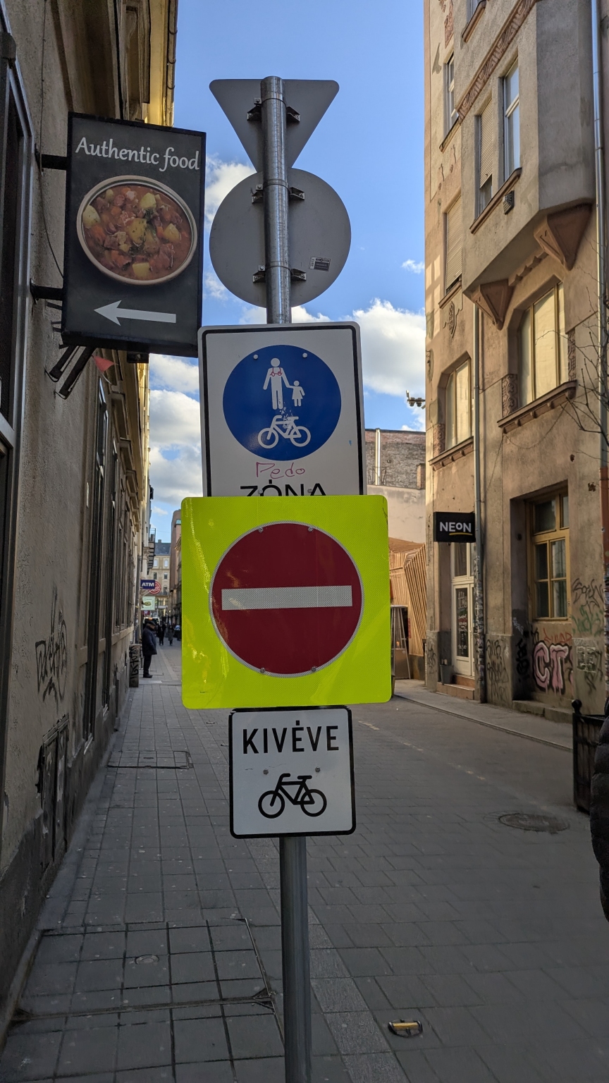 A Kazinczy utca sarkán elhelyezett táblák magasságukból fakadóan sérülésveszélyesek.
