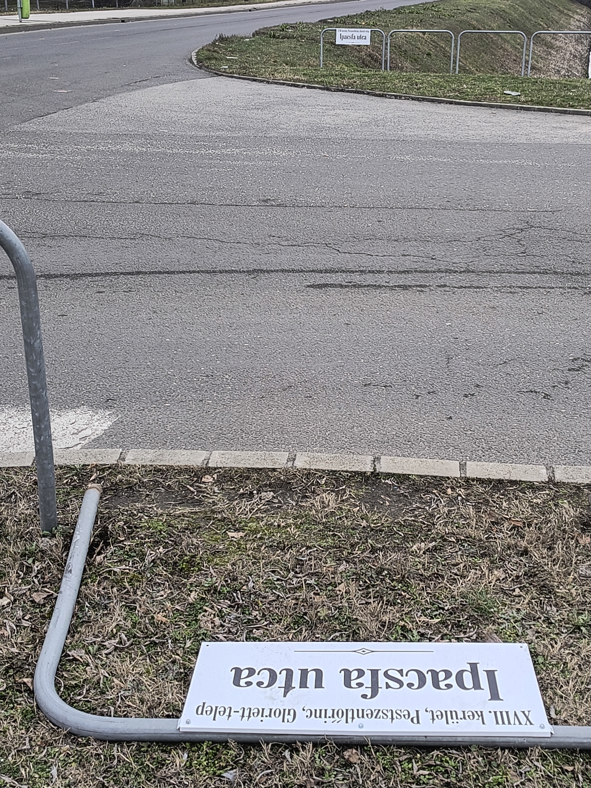 Kidőlt poller/térelválasztó korlát, és utcanév tábla.