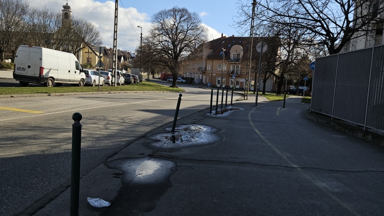 Kőbányán a Kápolna téren a parkolásgátló oszlopokat nem kímélték. 2024-ben még hibátlanul álltak sorban, mára több is hiányzik és egy (feltehetően baleset) nyoma is látszik.