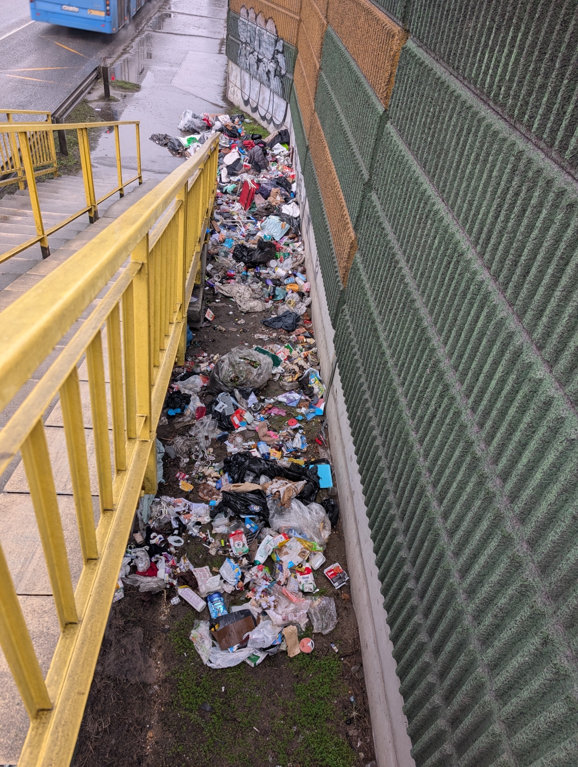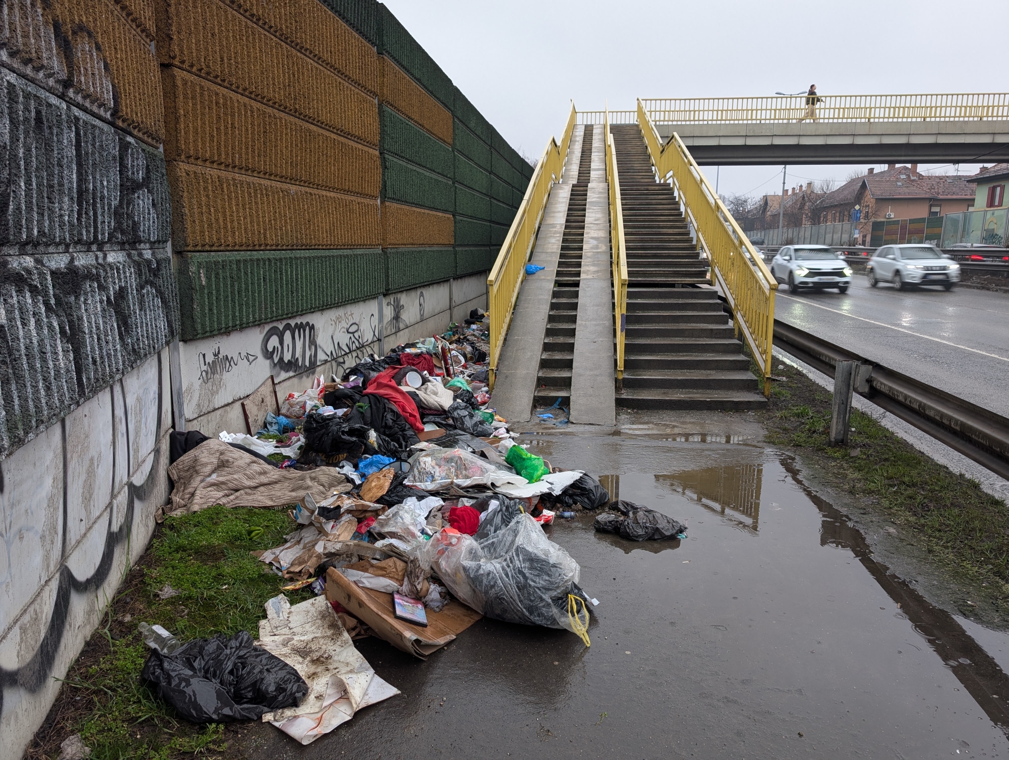 Nagykőrösi út Kossuth Lajos utca megállóhelynél a gyalogos felüljáró alatt rengeteg illegálisan kirakott hulladék halmozódott fel.