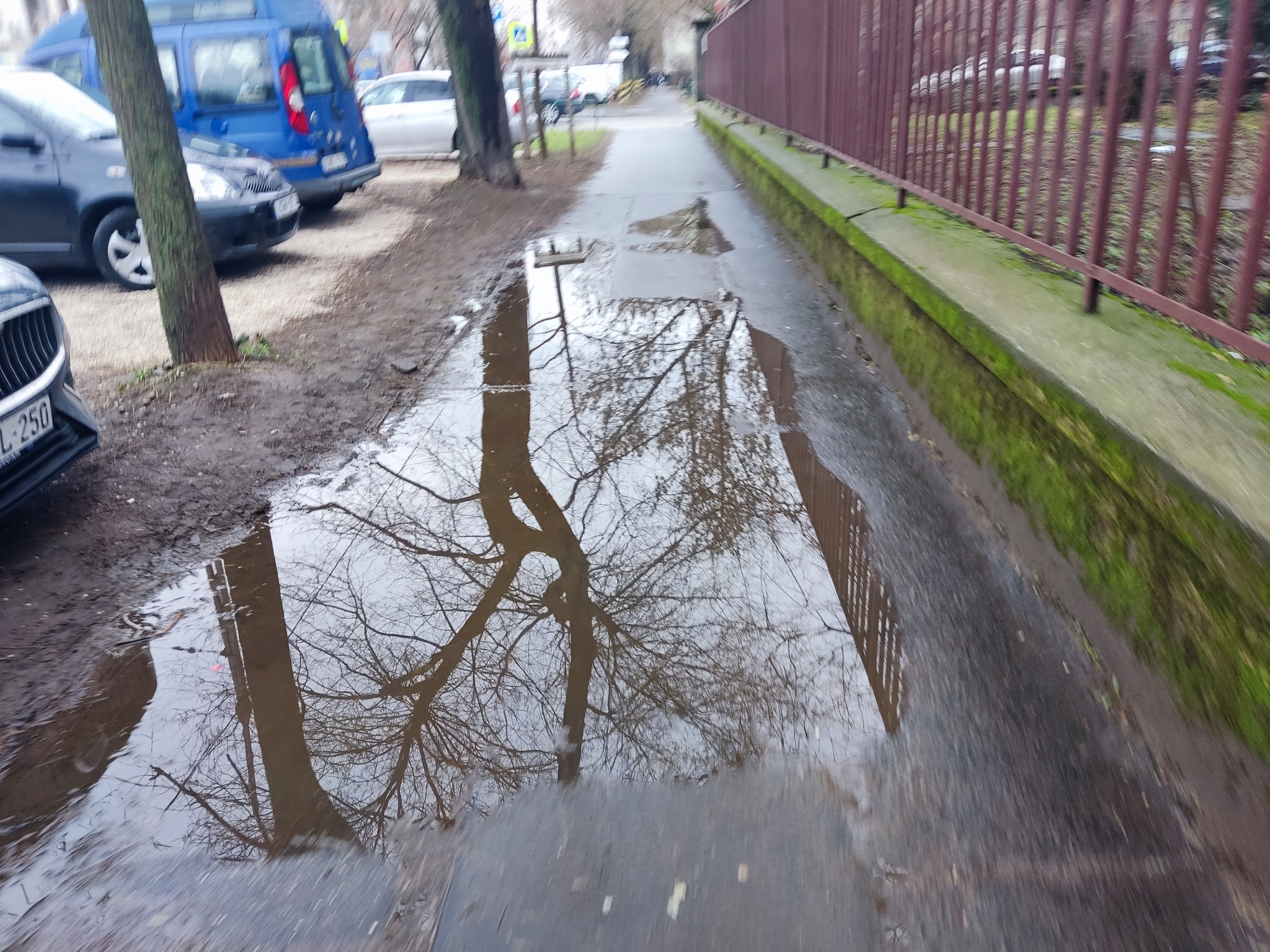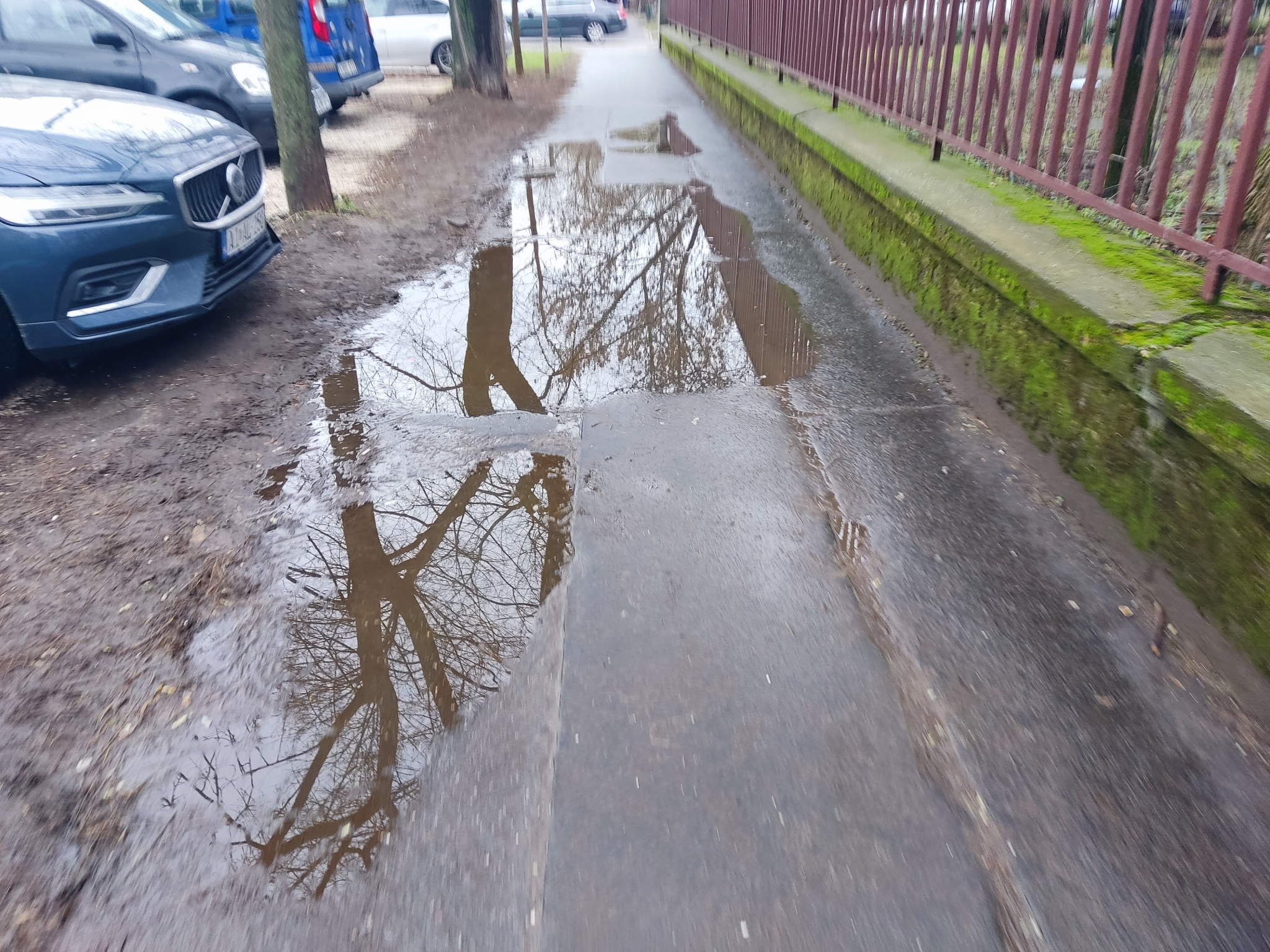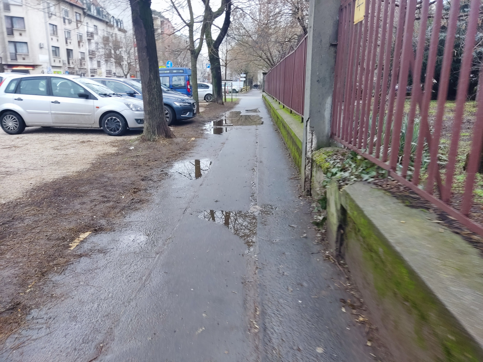 Megáll a víz az iskolához vezető forgalmas járdán. Akár burkolatbontási munka nélkül is javítható a helyzet, ha a járda mellett, a parkoló autók felől egy kisebb mélyedés kerül kialakításra, ahová a víz lefolyhat. Jelenleg a járda a legmélyebb pont, teljes szélességében elborítja a víz. A képen már a száradás közbeni állapot látható. Előre is köszönjük!