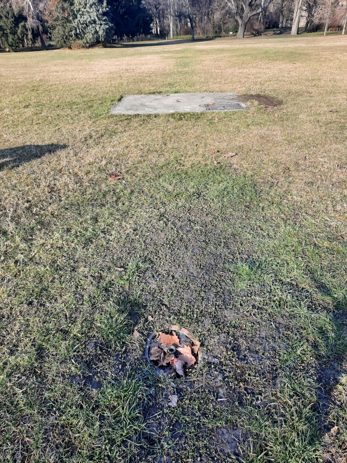 Árpád híd felől az ovális fénykert utána nagy réten, egy betonozott locsoló nagy akna melletti kis aknáról van szó.
