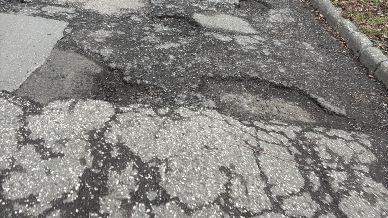 A XIX. kerület Vajk utca 9. szám előtt és annak közelében számos kátyú van az úton.