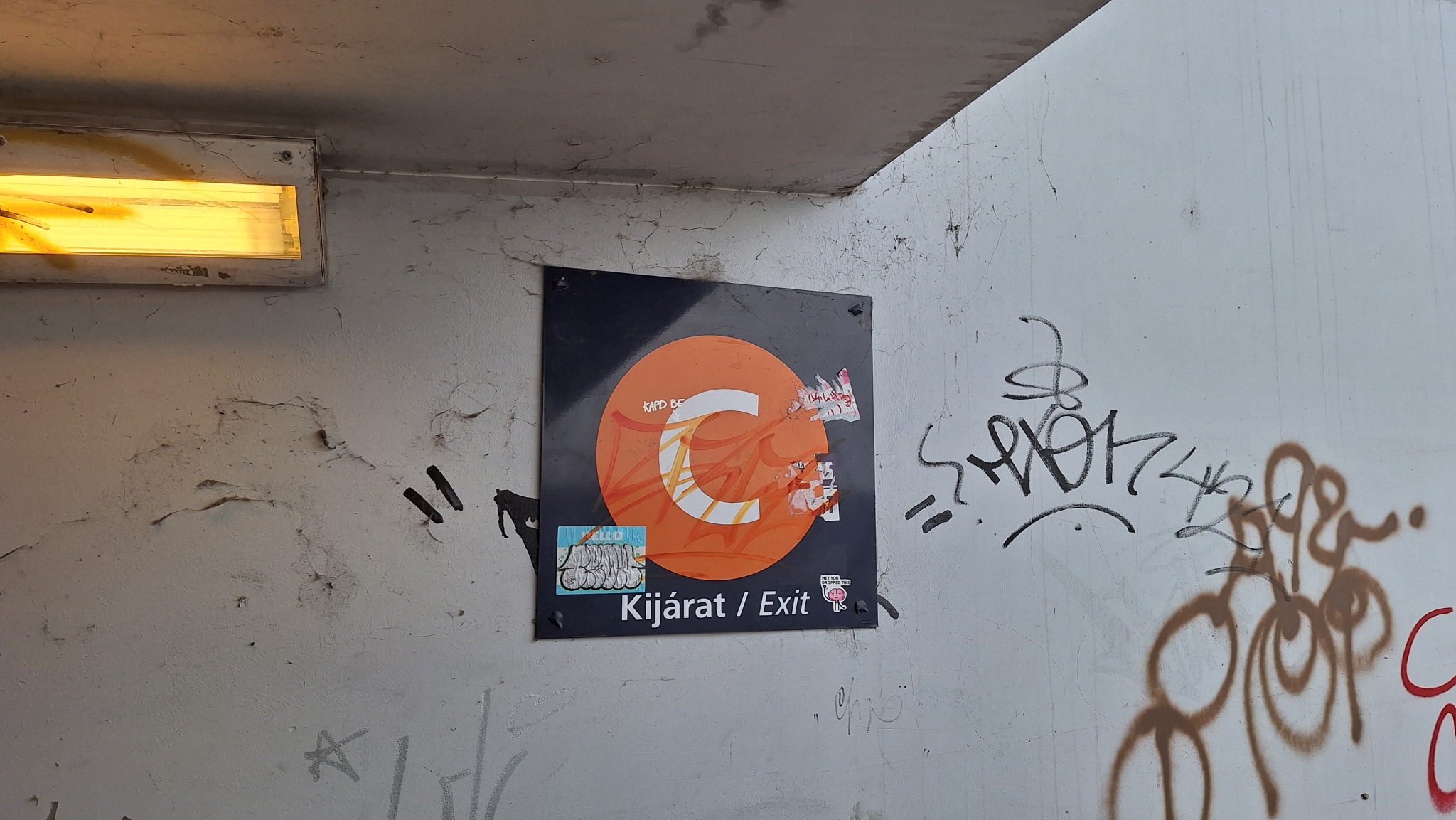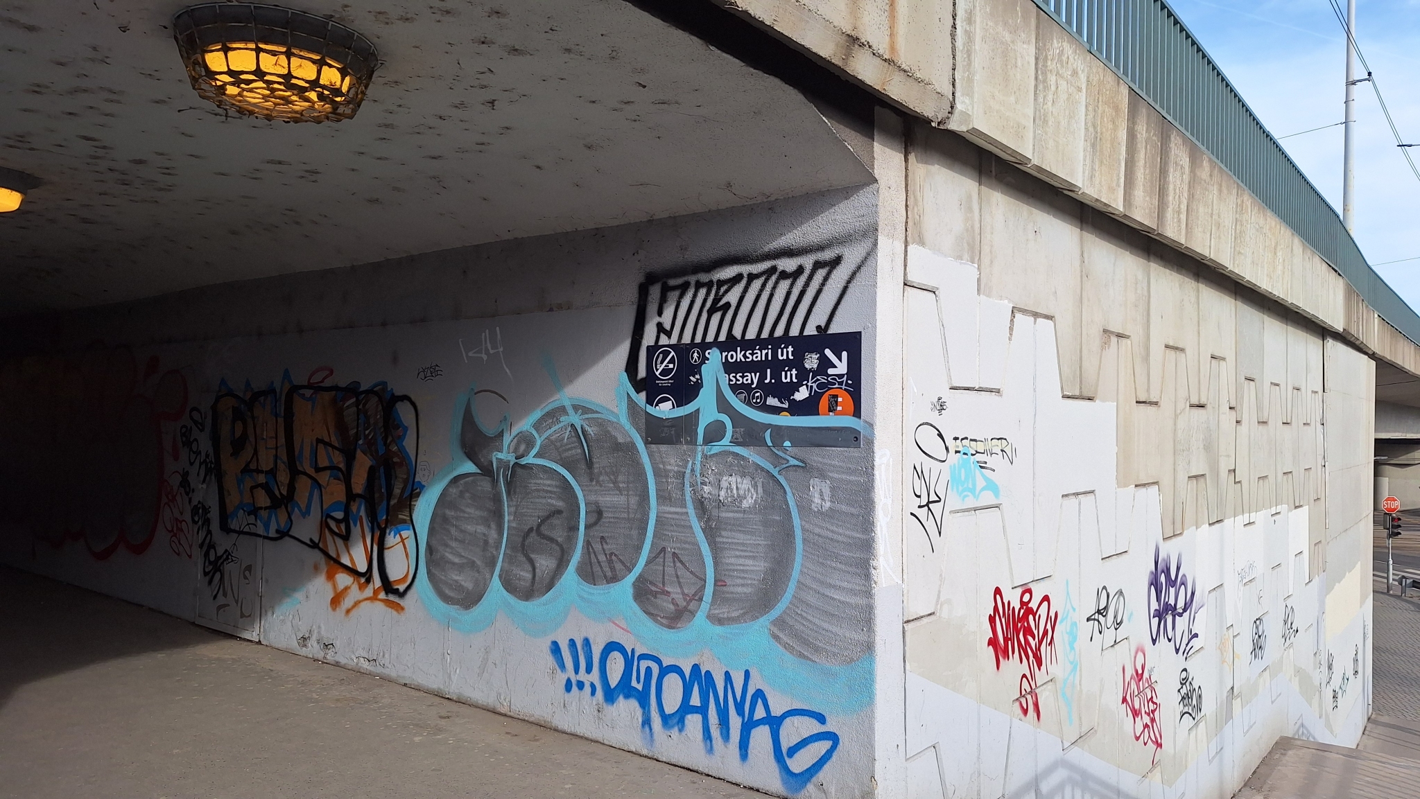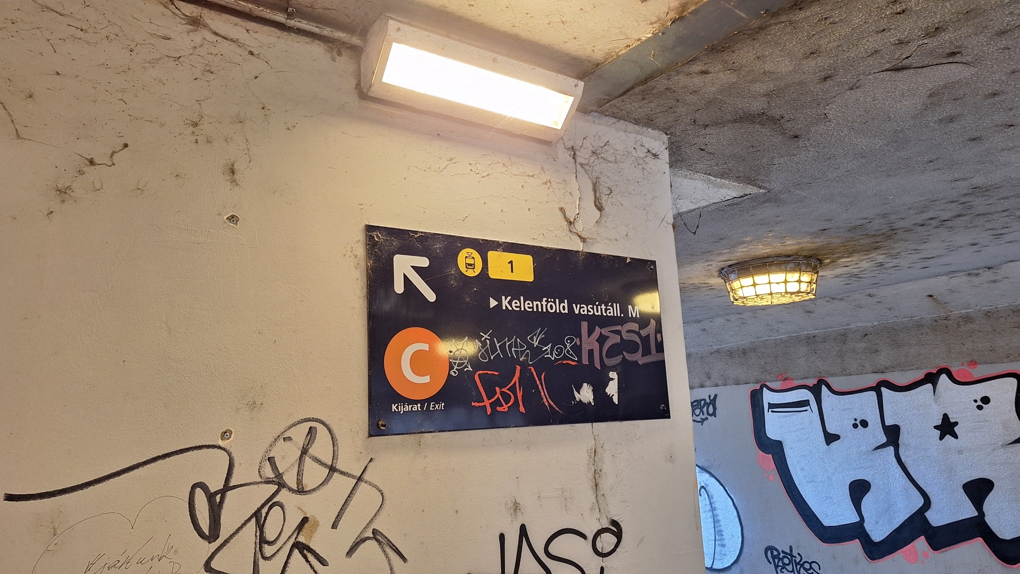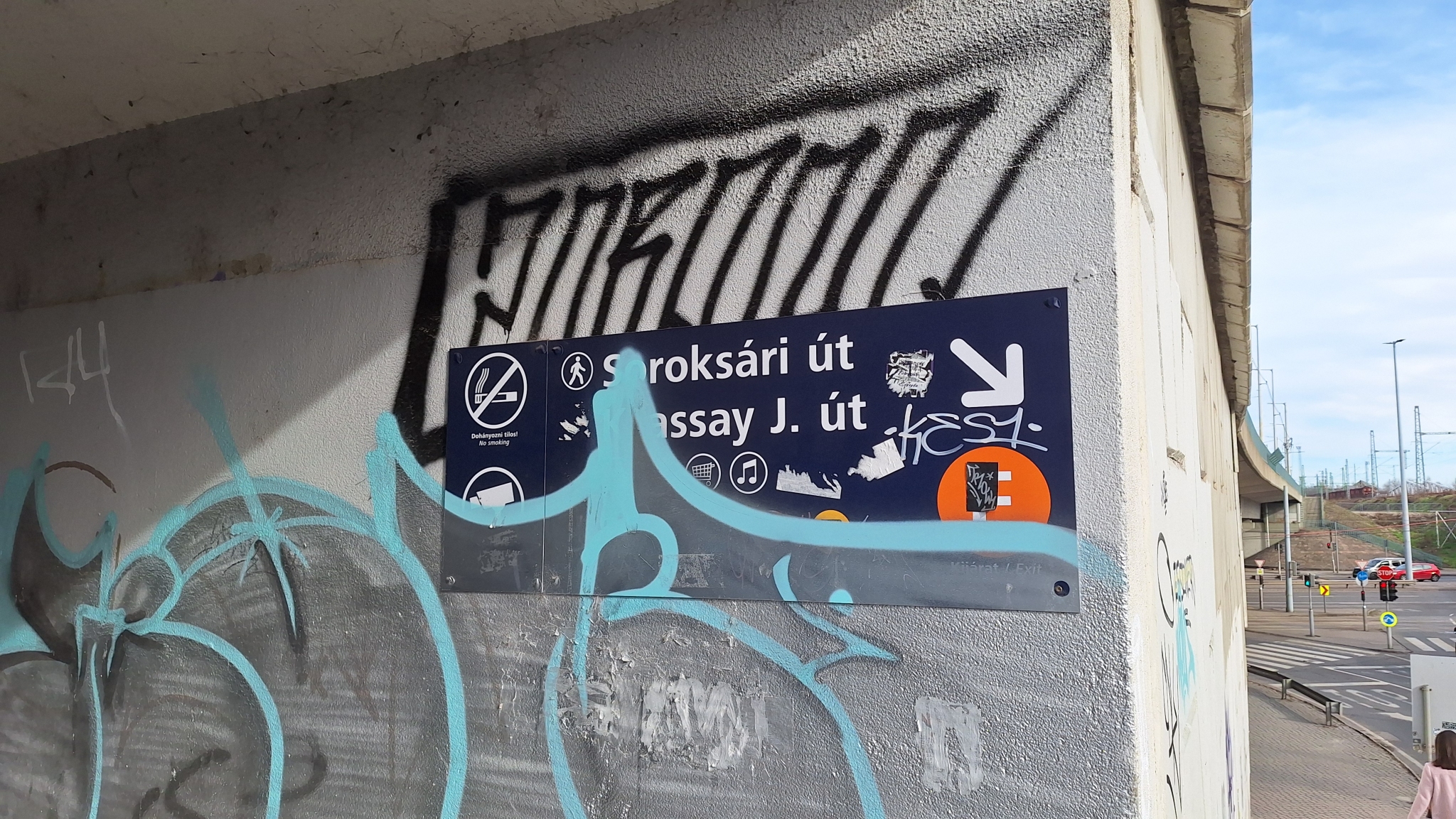 A Közvágóhídnál az 1-es villamoshoz vezető aluljáróban szét vannak firkálva a tájékoztató táblák, van amelyik gyakorlatilag olvashatatlan.