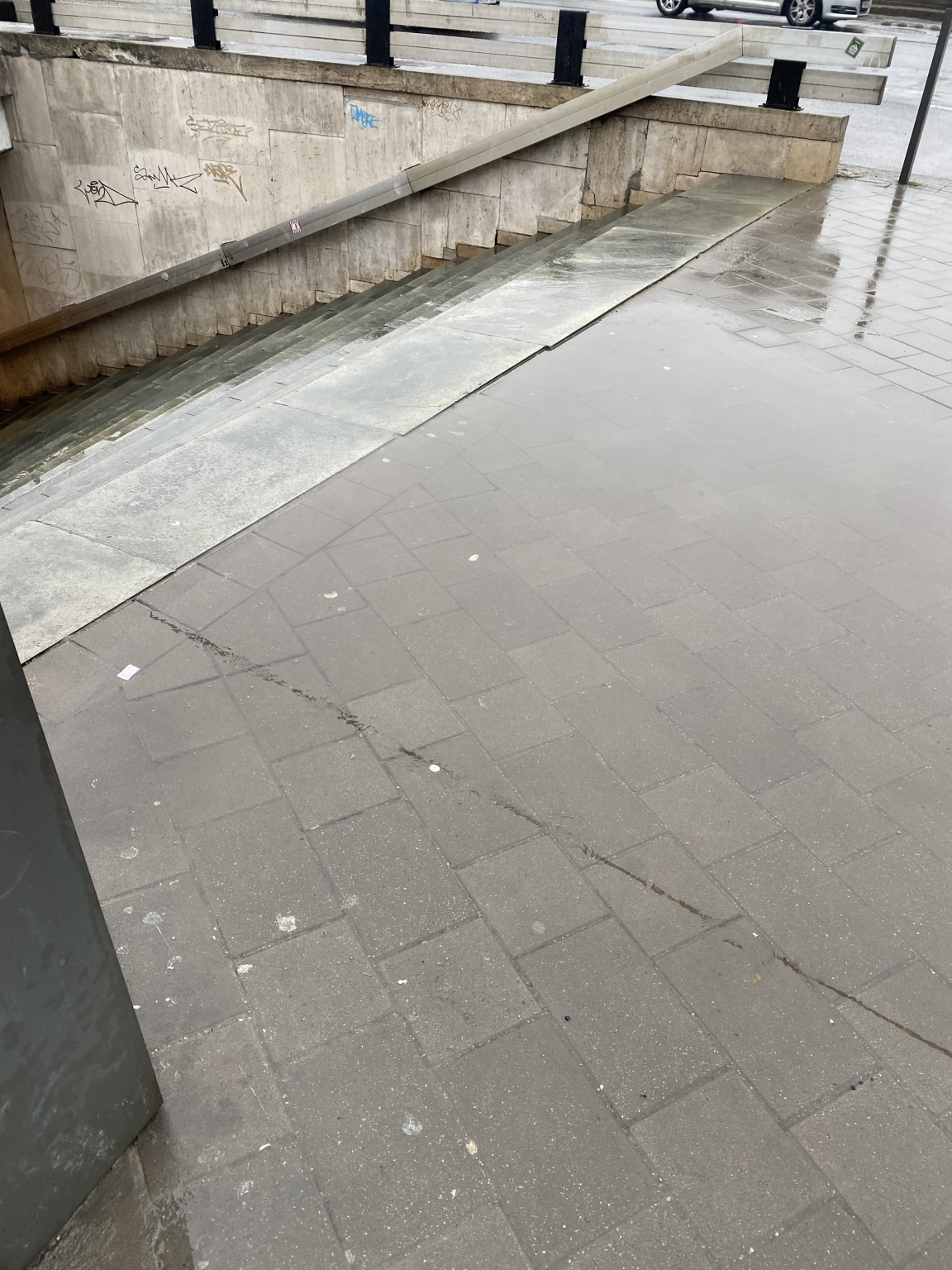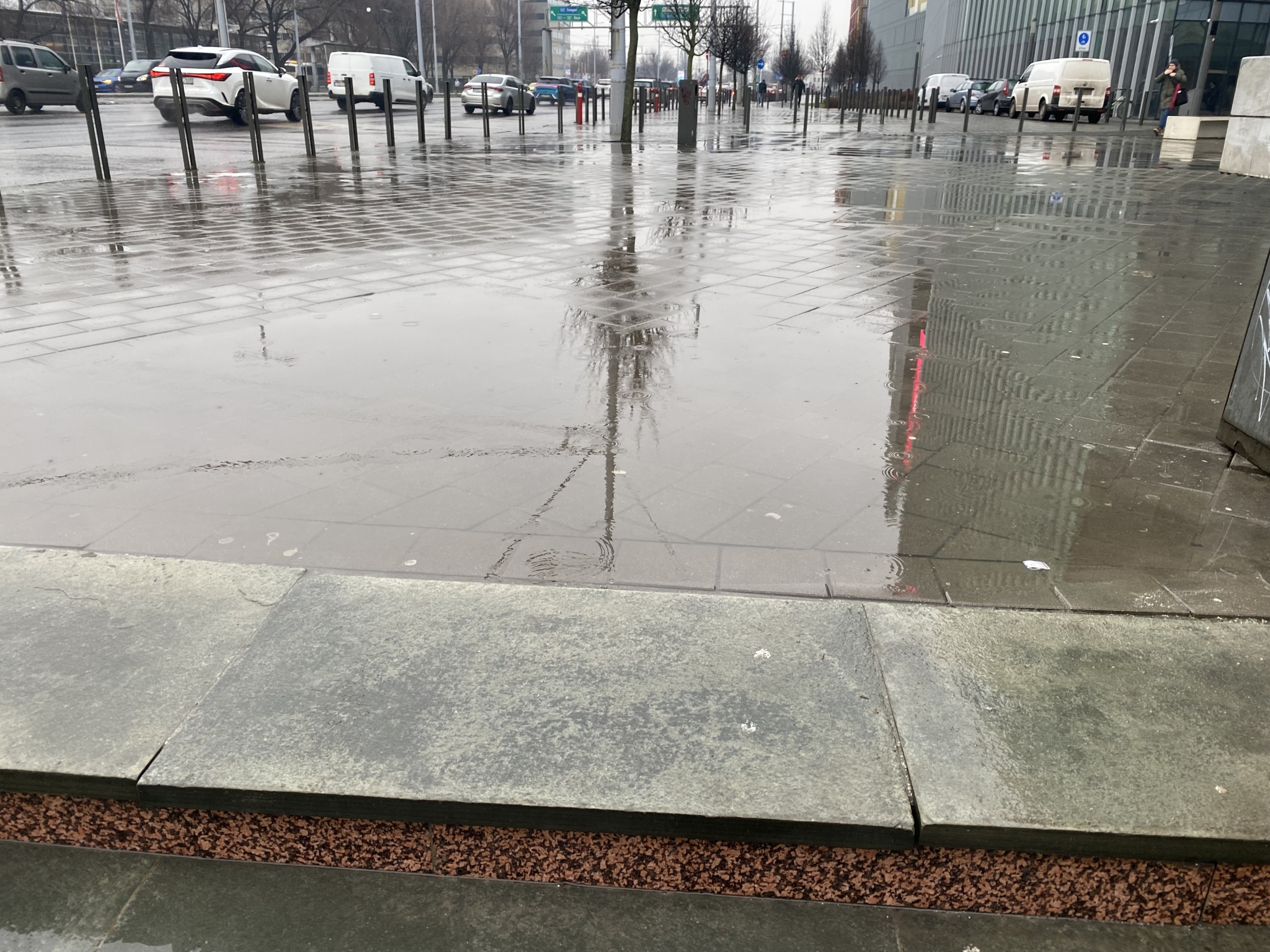 M3 Népligeti aluljáróból a Telekom Campus felé felvezető lépcső tetején (G lépcső ha jól látom a térképen) nagy területen folyton áll a viz. Kb bokáig ér a dolog. Ez egy térkővel viszonylag frissen kirakott terület, amit nem sikerült szépen használhatóra megcsinálni. A Campusba, illetve a mellette lévő liberty irodaházba és a mögötte lévő Fradi stadionba tartó nem kis számú ember ebben jár bokáig esőzések idején és utána is napokig.