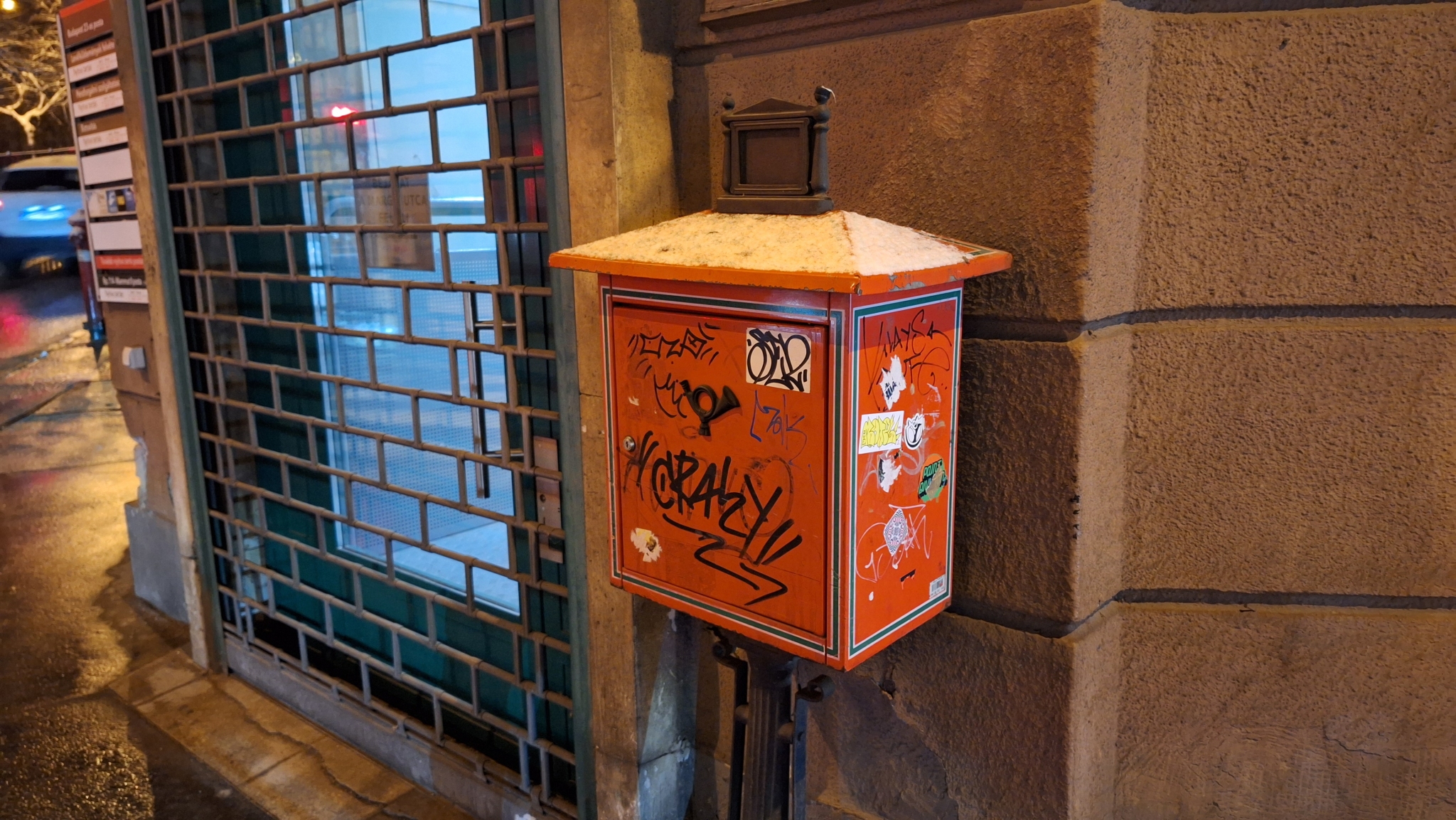 A Margit és a Török utca sarkán álló levélgyűjtő szekrény firkás, tele van matricázva.