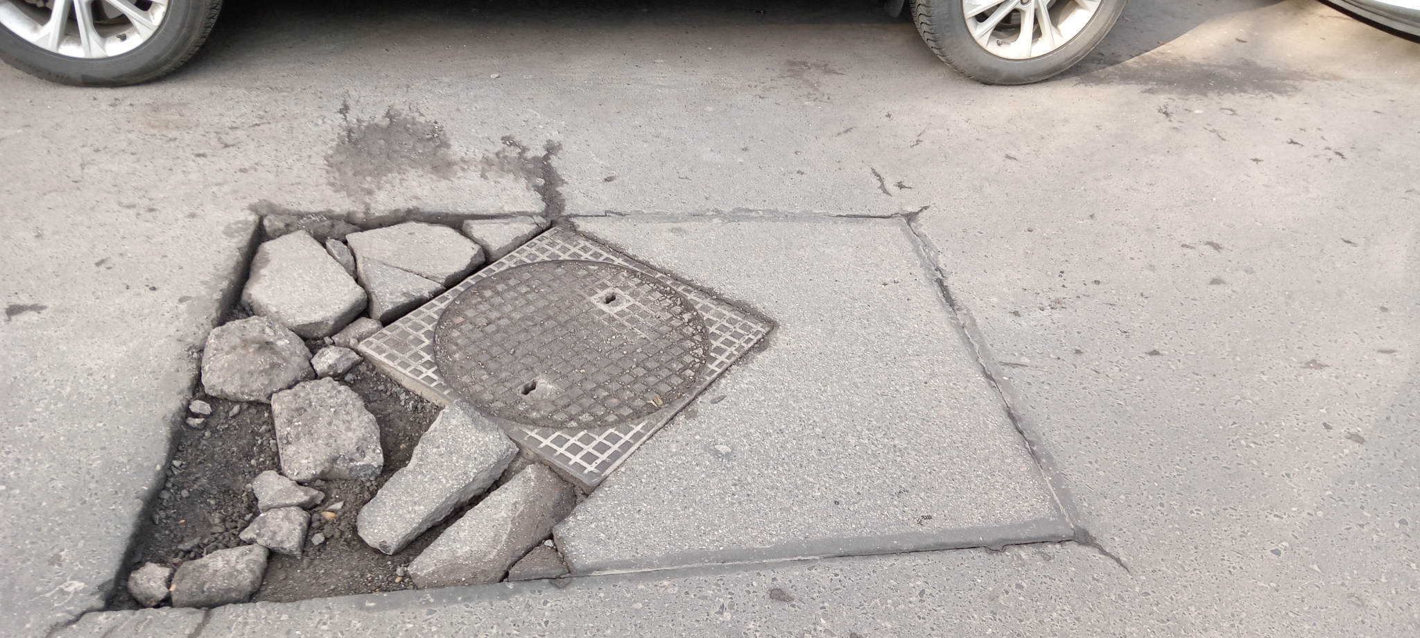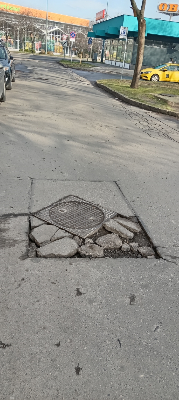 A Pillangó park 16/D előtt lévő sérült aknafedél, feltöredezett nagyobb aszfalt darabok okozhatnak problémát az ott elhaladó gyalogos-, kerékpáros és gépjármű forgalomban résztvevőknek.
