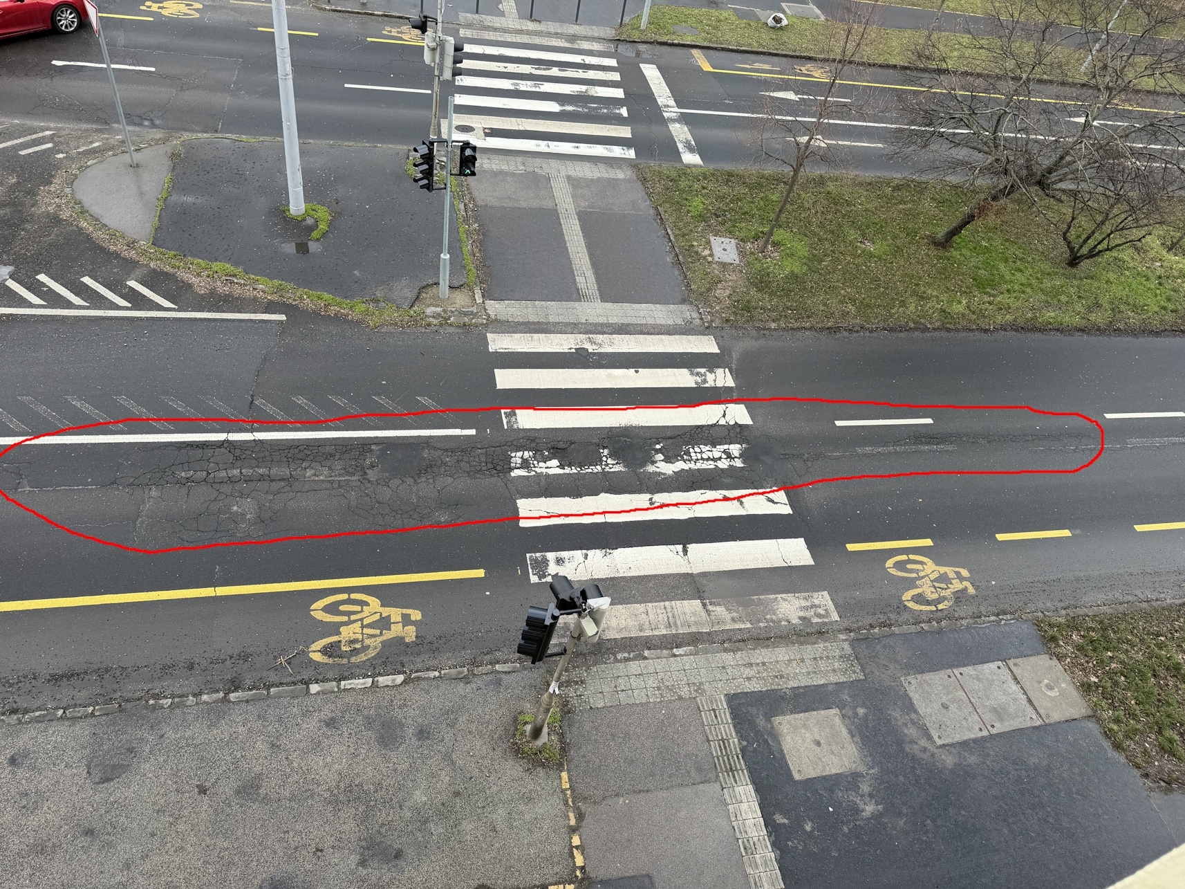 A 1113 Budapest, Karolina út 41. előtti, társasház felőli forgalmi sávban az útburkolat a keréknyomokban jelentősen feltöredezett és egyenetlenné vált. Az úthibákon áthaladó járművek, különösen autóbuszok és tehergépjárművek, folyamatosan erős rezgéseket okoznak, amelyek a közvetlenül érintett lakóépületben is érzékelhetők. A rezgések intenzitása az út állapotának romlásával számottevően felerősödött. A jelenlegi állapot miatti erős rezgések kockázatot jelenhetnek a társasház statikai állapotára.