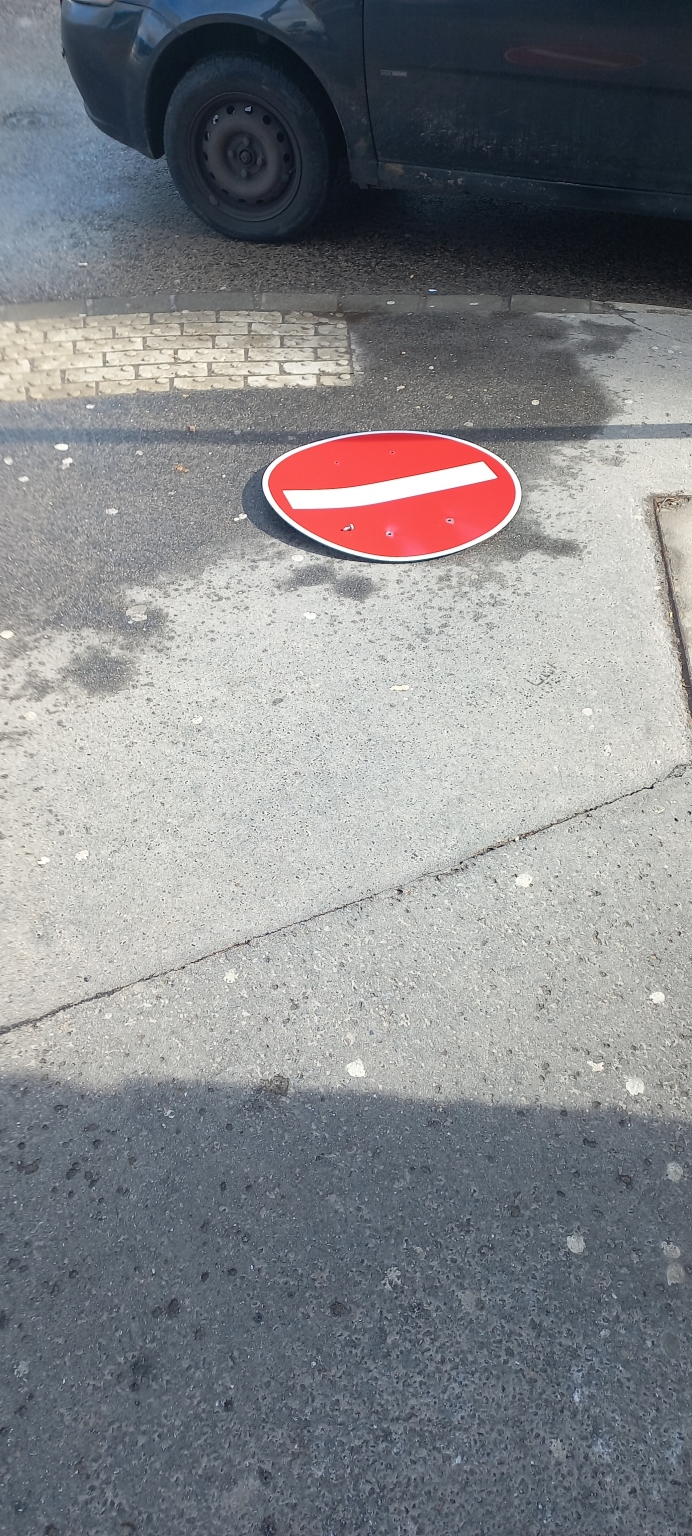 1042 Budapest Árpád út Kassai utca sarok, leesett a kilazult csavaros behajtani tilos tábla.
