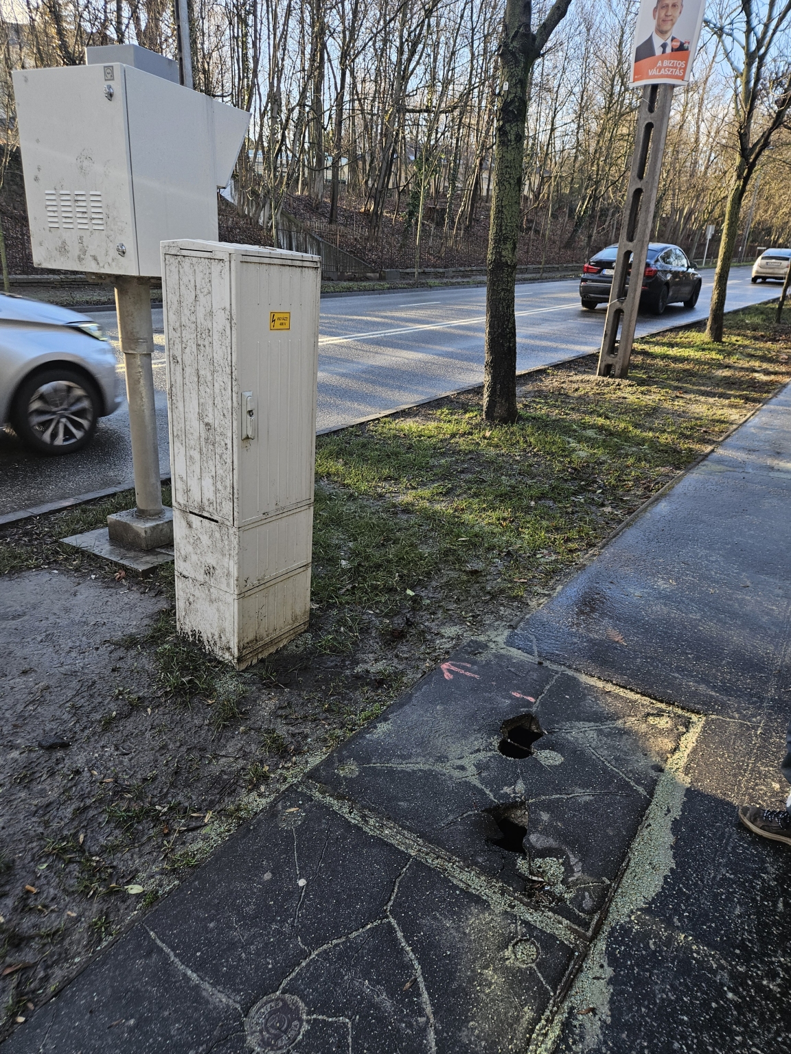 A Hűvösvölgyi út 145.számnál, a sebességmérőnél hatalmas lyuk tátonf a csatornafedélen, ami egyre csak növekszik. Az óvodás fiam lába belefér, de minden arra közlekedő számára balesetveszélyes.