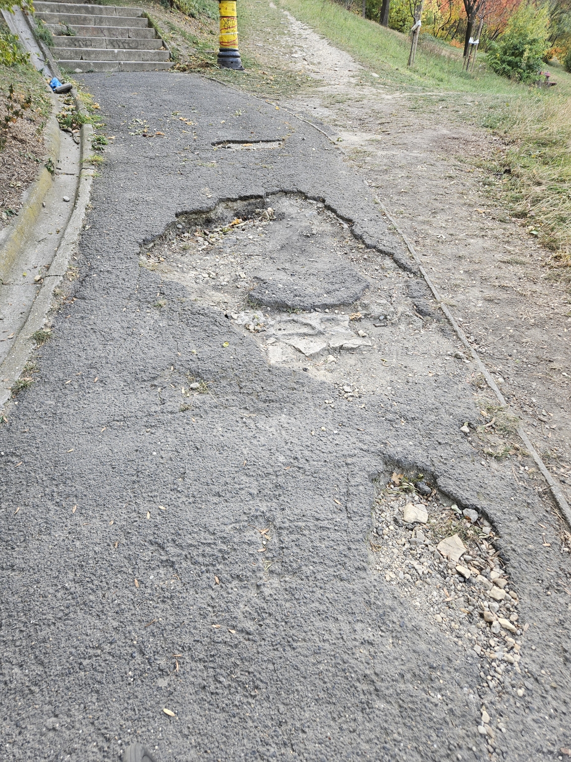 I. ker Antal lépcső sétányon kátyu, a mellette lévő kandelláberek kitörve így sötétben bokaficam veszély. (2024. jan óta)