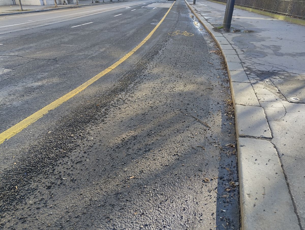 A Baross utca Horváth Mihály téri szakaszán a kifelé menő oldalon a kerékpársáv tele van apró aszfaltdarabkákkal, vélhetően kátyúzásból visszamaradt anyag szóródhatott szét. Rendkvül zavaró, csúszós, balesetveszélyes, kérem feltakarítani!