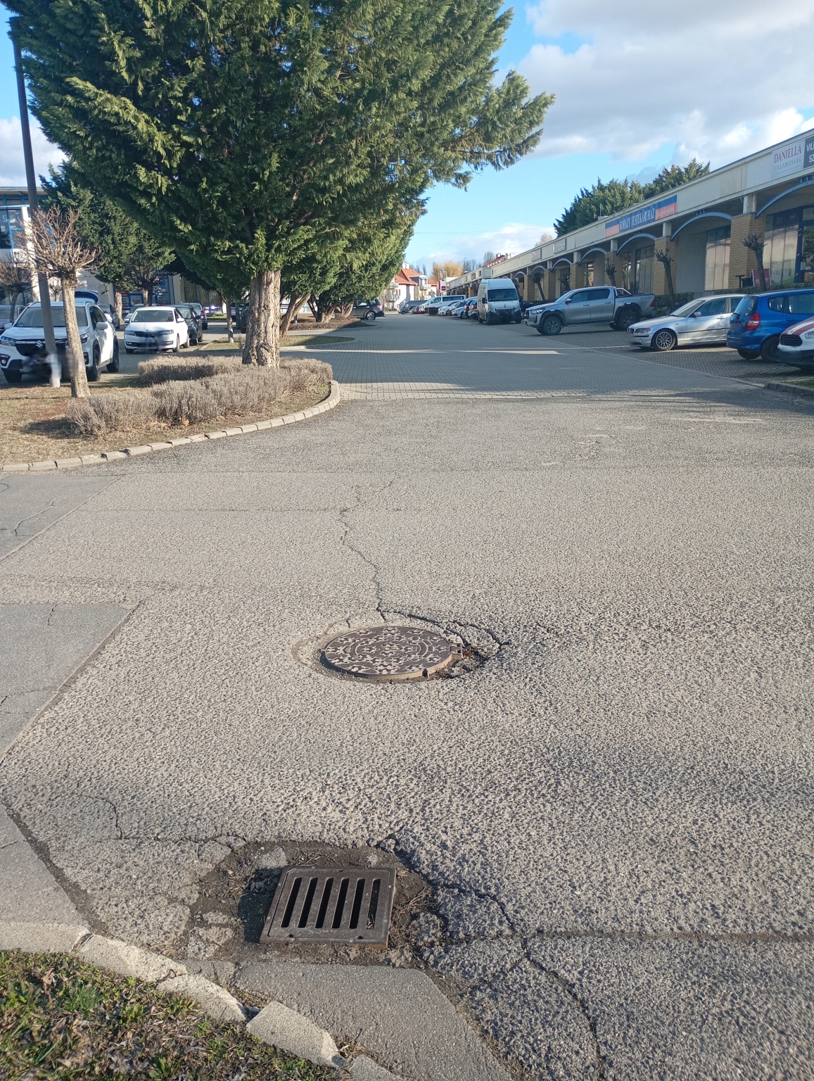 Kérem az illetékest, hogy a képen látható csatornafedél, illetve csatornanyílás körül hiányzó aszfaltot pótolni szíveskedjenek!