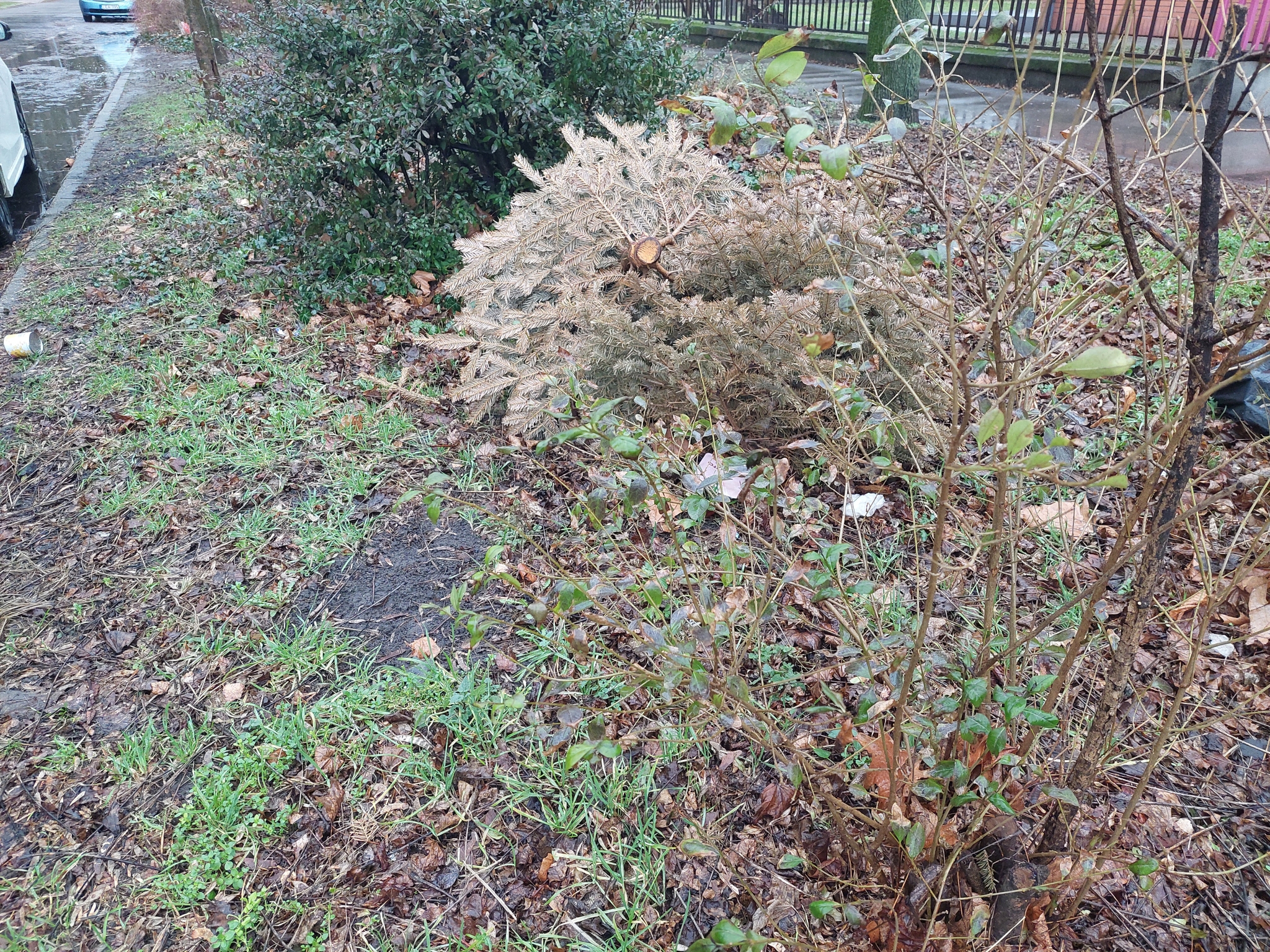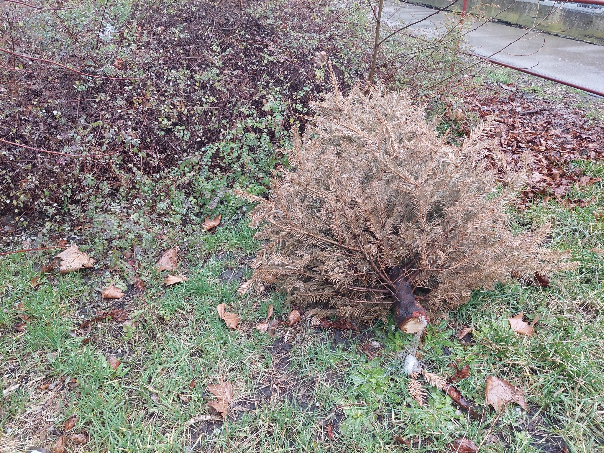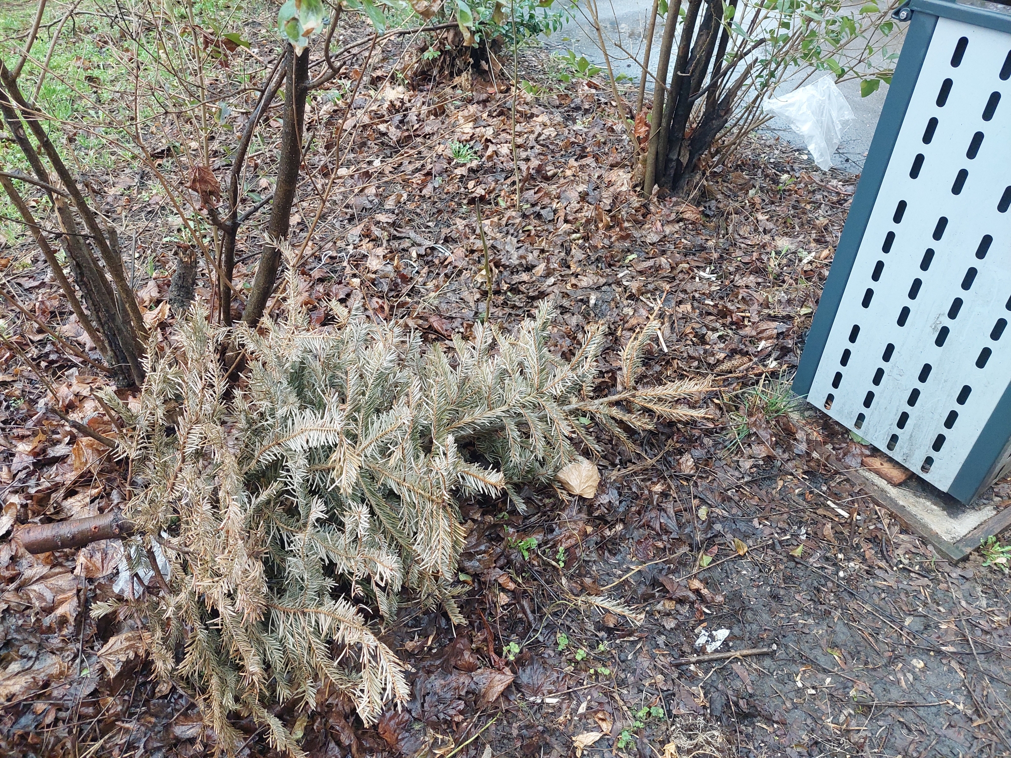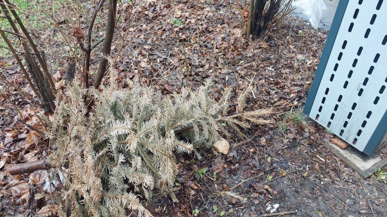 Szemetes terület, elszáradt karácsonyfával, szemeteszsákkal, állattetemmel. Telecom oktatási központja előtt.