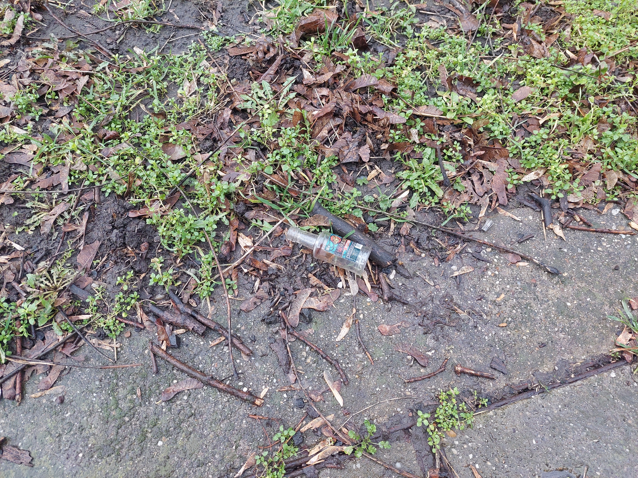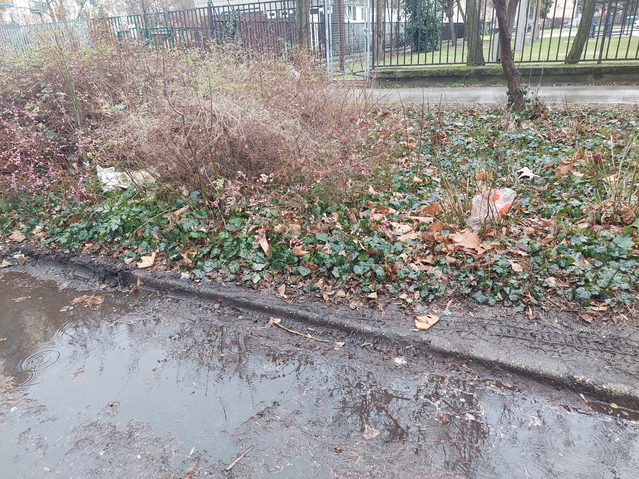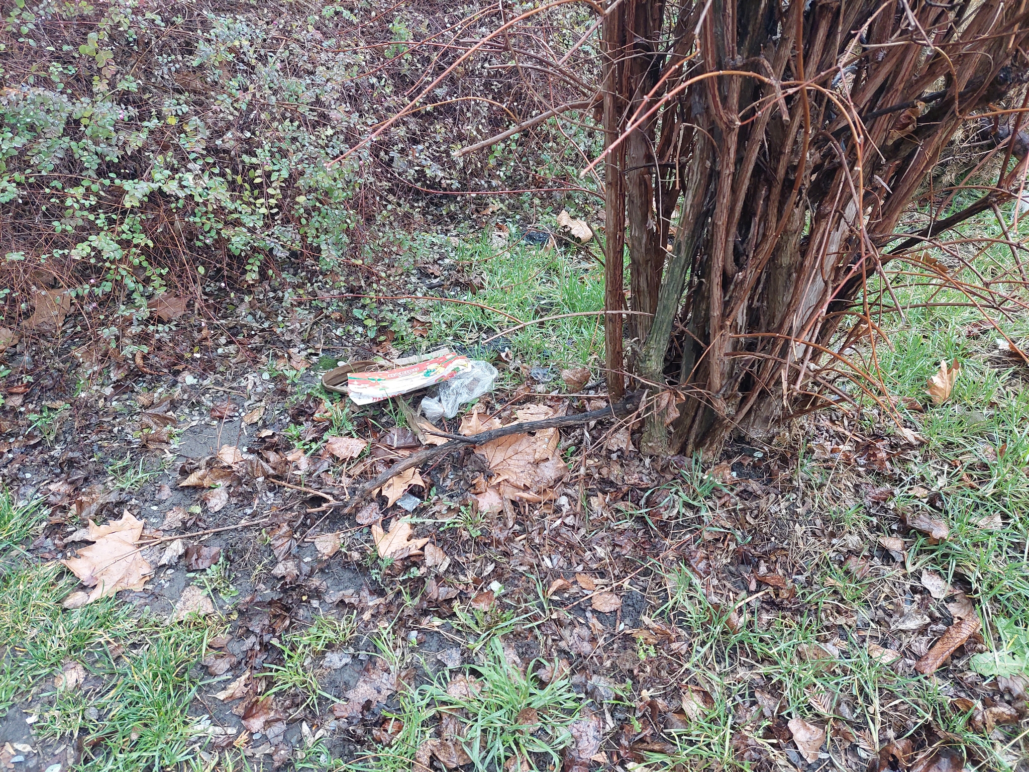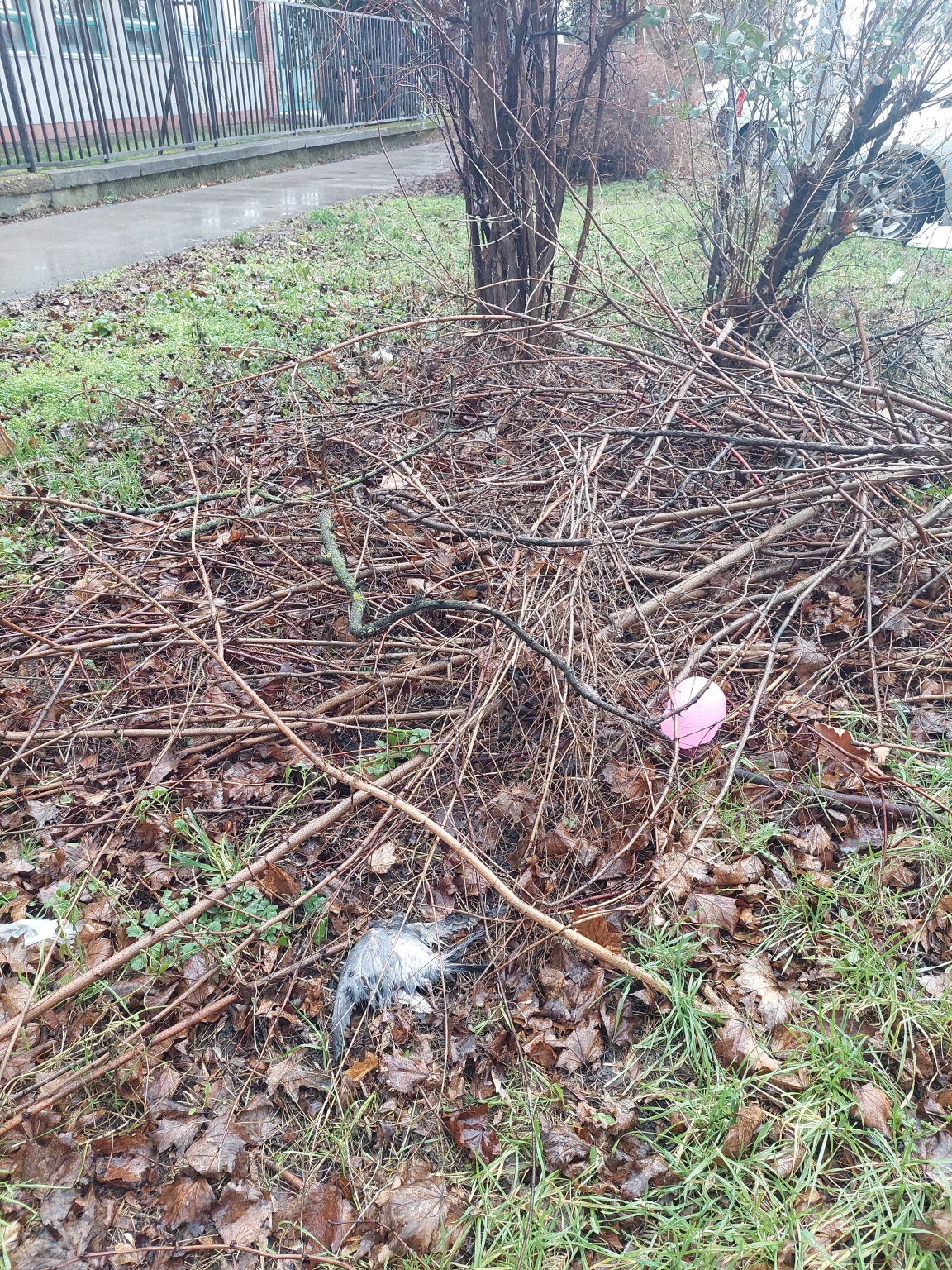 Szemetes terület, elszáradt karácsonyfával, szemeteszsákkal, állattetemmel. Telecom oktatási központja előtt.