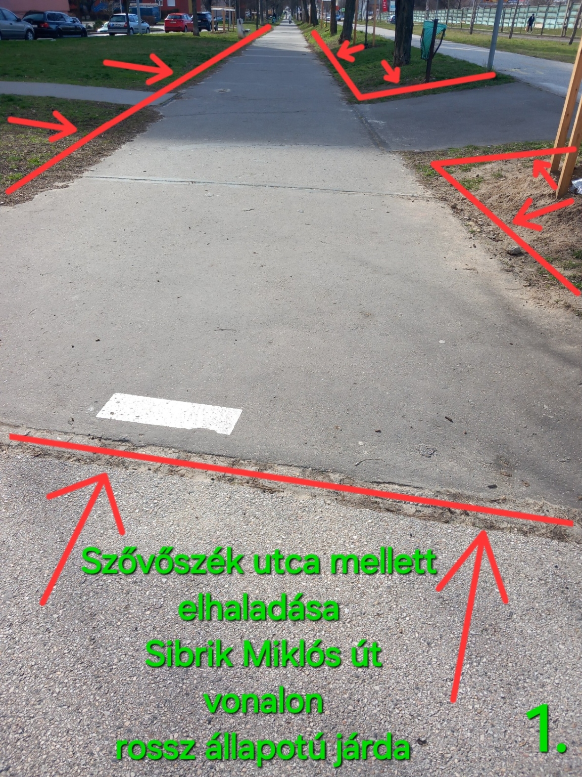 Értesítem hogy a Szővőszék utca mellett elhaladáson Sibrik Miklós út vonalon Bányató utca között gyalogos járdaszakasz rossz állapotban van, olyan mennyiségben és süllyedések vannak hogy lassan alig lehet gyalogosan közlekedni ezen járdaszakaszon. Rá férne Sibrik Miklós út és Bányató utca között járdaszakaszra járdafelújitas