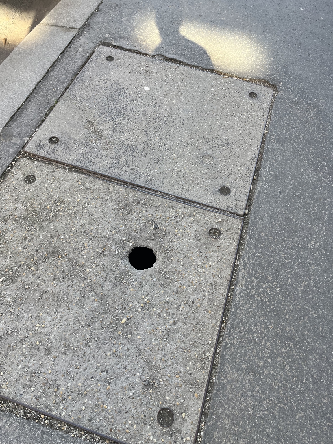 A sarkon lévő aknafedlap lyukas, balesetveszélyes.