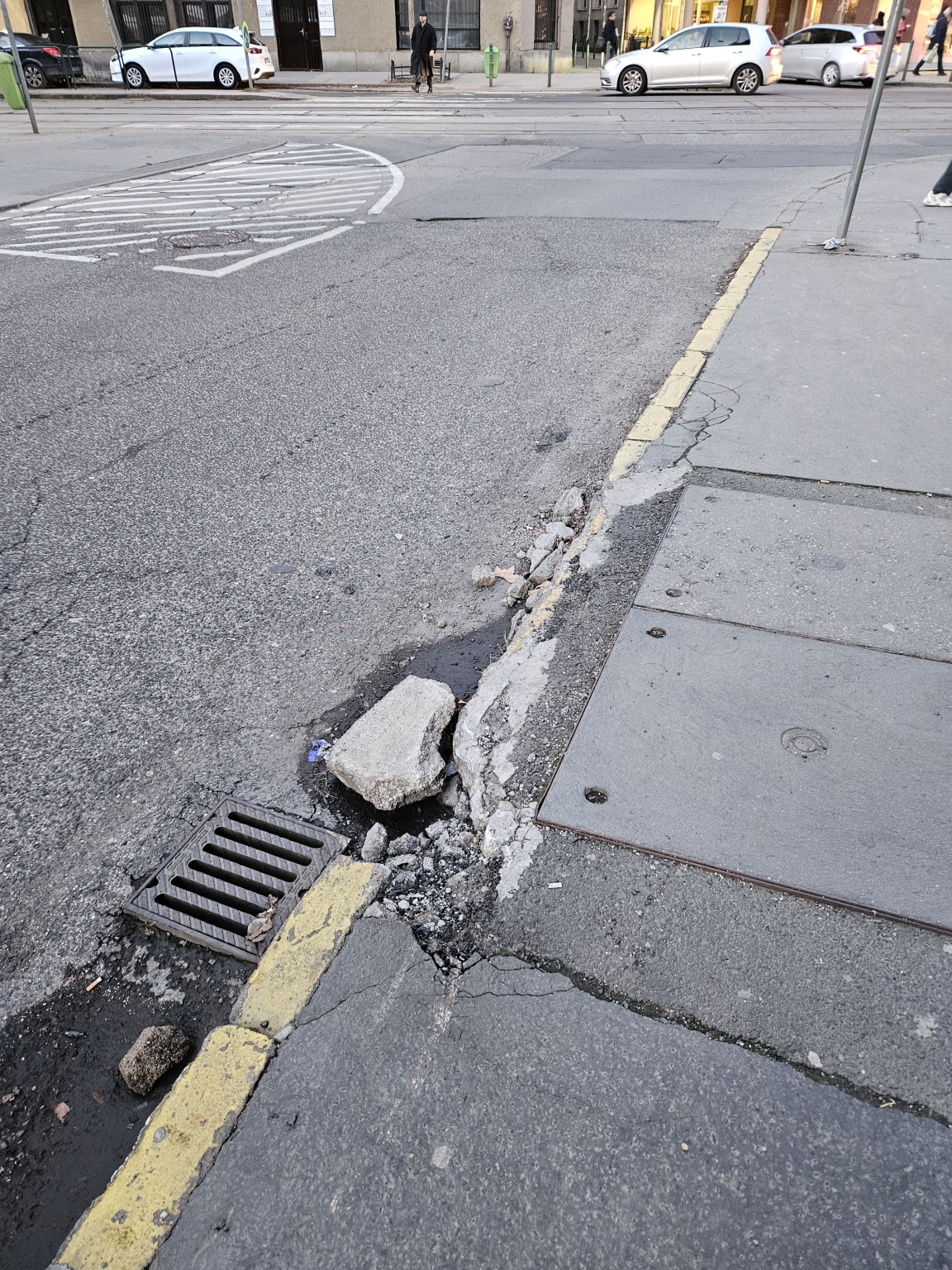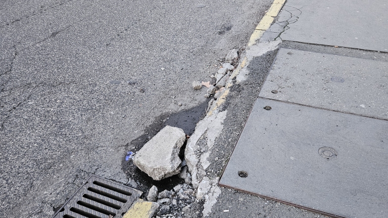 Törött a járdaszegély és serült a járda az Ipar utcán, a Mester utcánál.