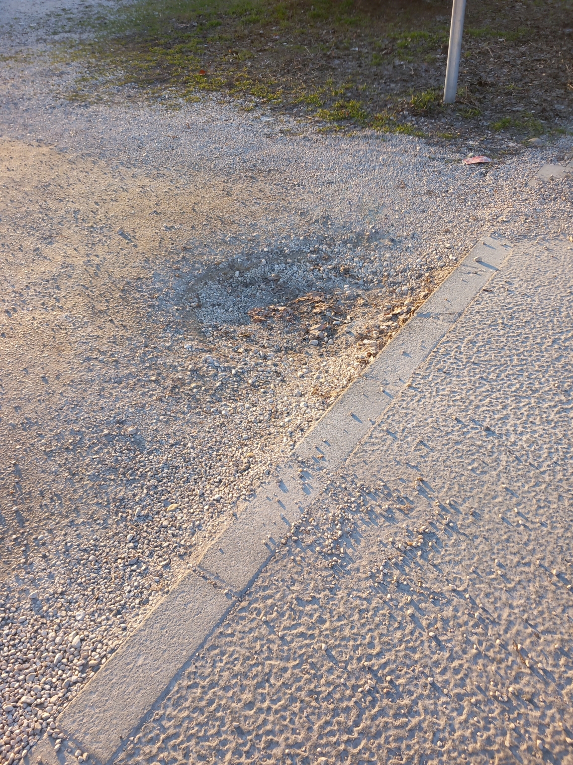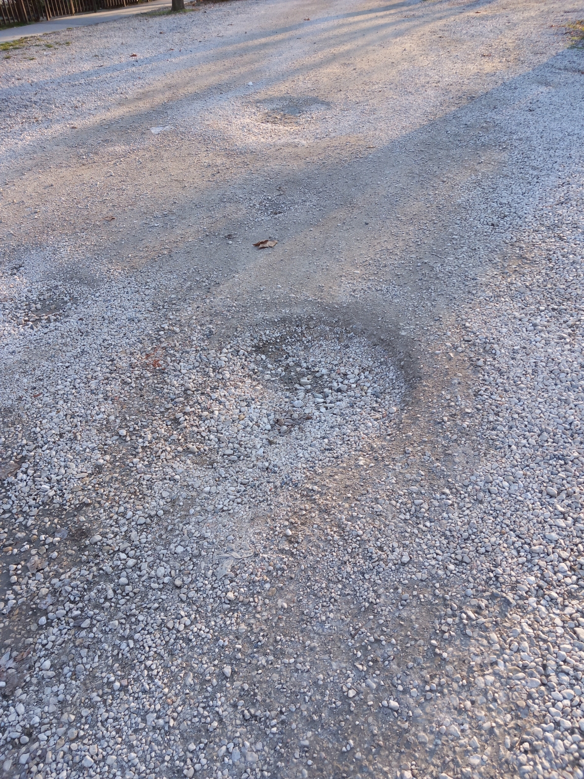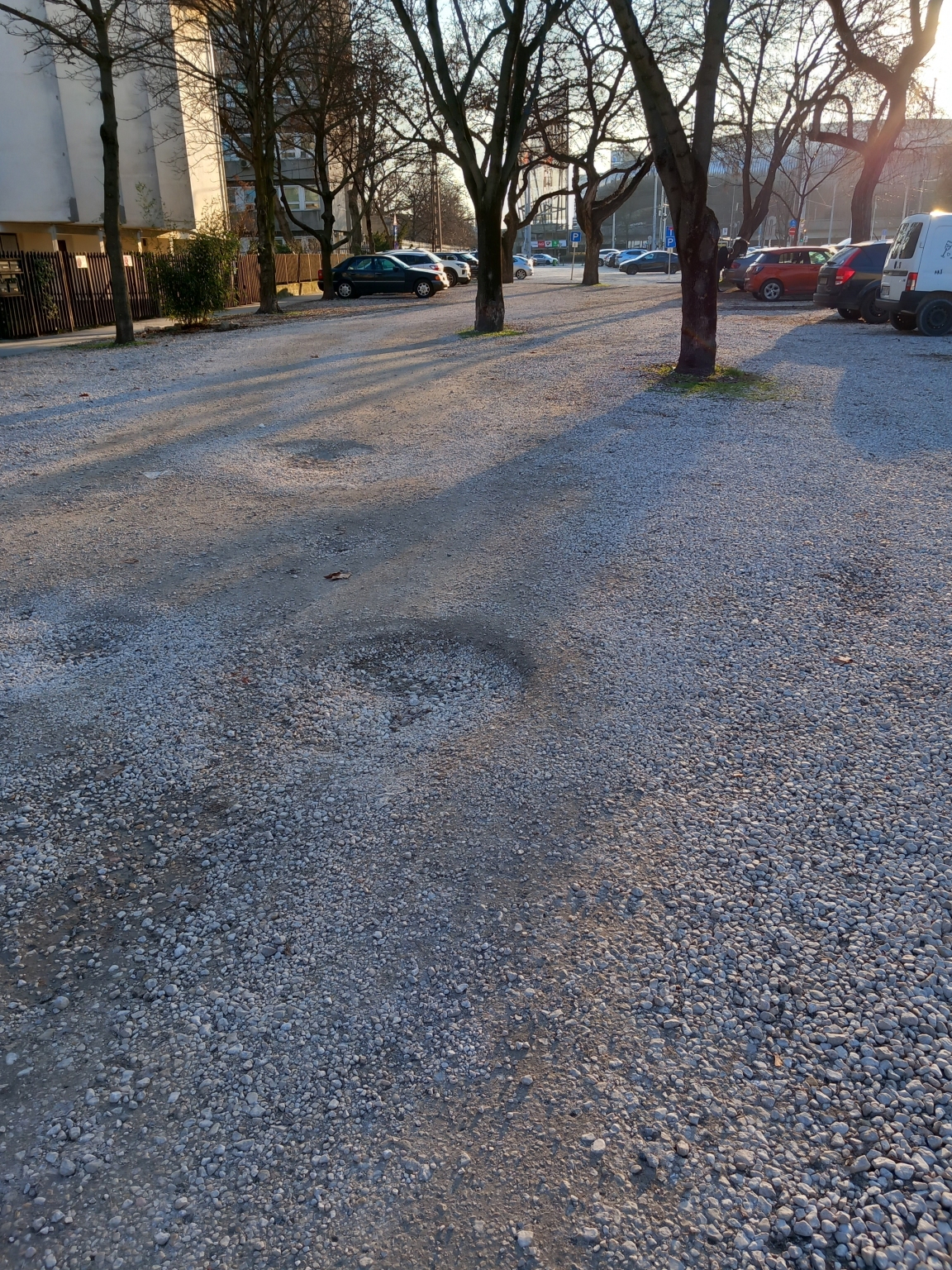 XIV.ker. Mogyoródi ú 3-7 előtti murvás fizetős parkoló tele van kátyúval.