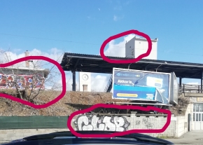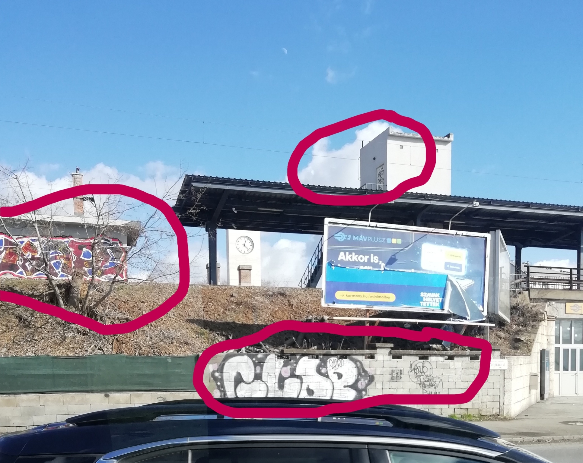 A Kőbánya-alsó vasútállomás egyes részépületein és védfalán nem rég óta nagyobb és kisebb graffitik jelentek meg, elcsúfítva a frissített épületeket. Jelenleg végre zajlik az egész állomásépület rendbehozatala. Kérjük, hogy egyúttal távolítsák el ezeket a graffitiket is! A fotón bejelöltem ezeket! Köszönjük!
