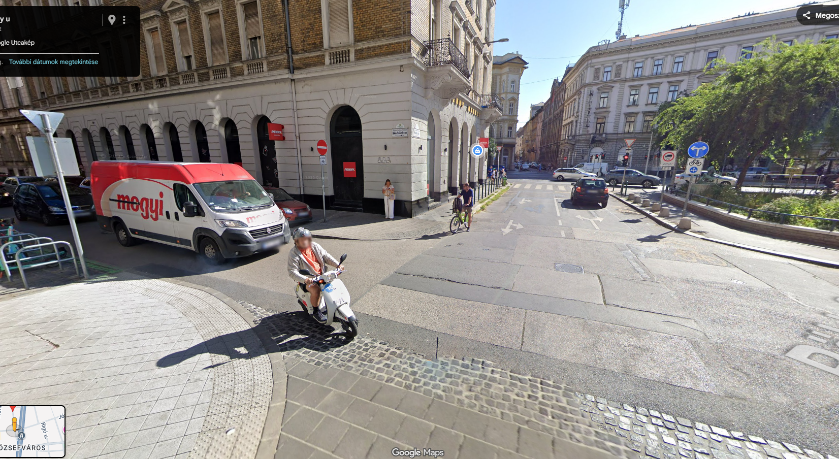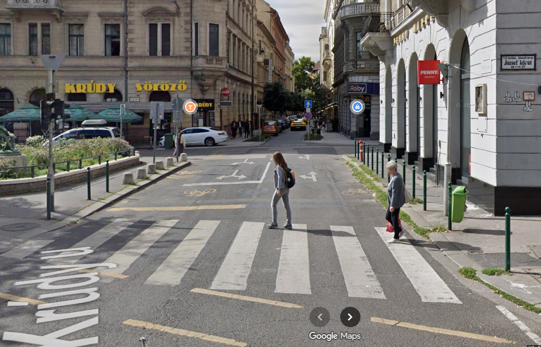 A mellékelt képeken is jelölésre került a lehetséges konfliktushelyzet. A József körút felől a Krúdy Gyula utcába érkező, majd onnan balra kanyarodó jármű vezetője interakcióba kerül a szemből, a Krúdy Gyula utcából egyenesen kihaladó kerékpárossal. Azonban az bizonytalan, hogy ilyen helyzetben a kerékpáros részére kihelyezett EAK tábla alapján a balra kanyarodónak, vagy a kanyarodási szabály alapján a kerékpárosnak van-e elsőbbsége.