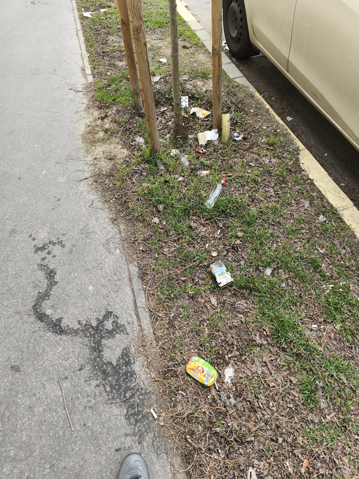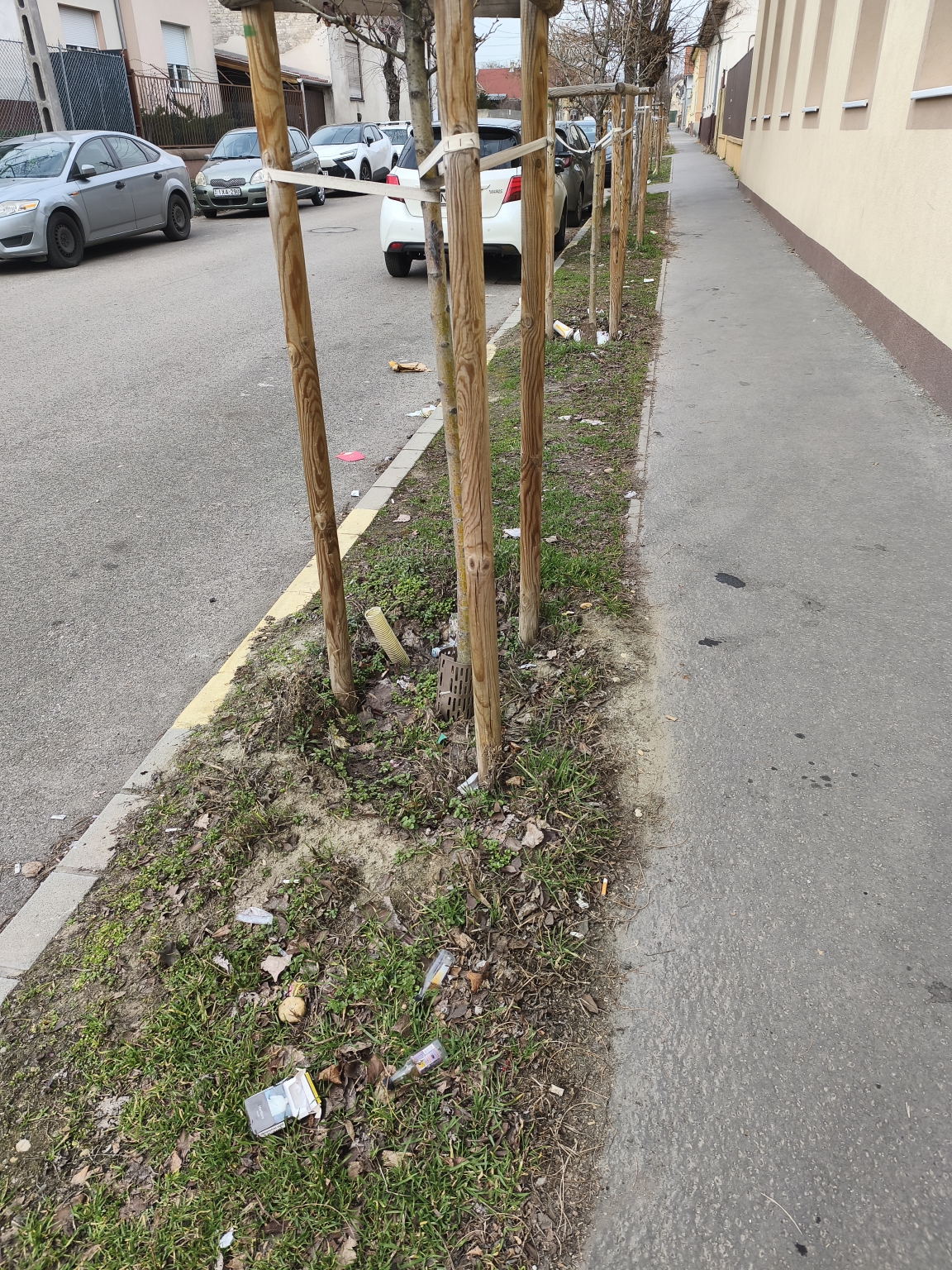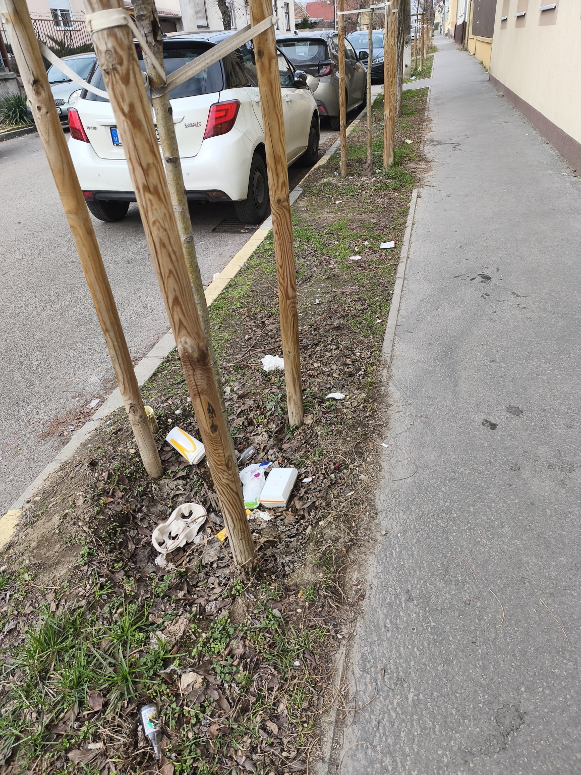 A XX. kerületi gyermekorvosi rendelő menti zöldsávban végig áll a szemét