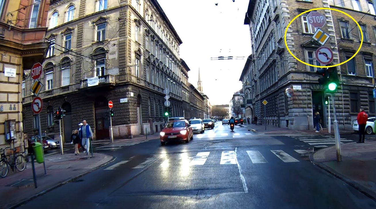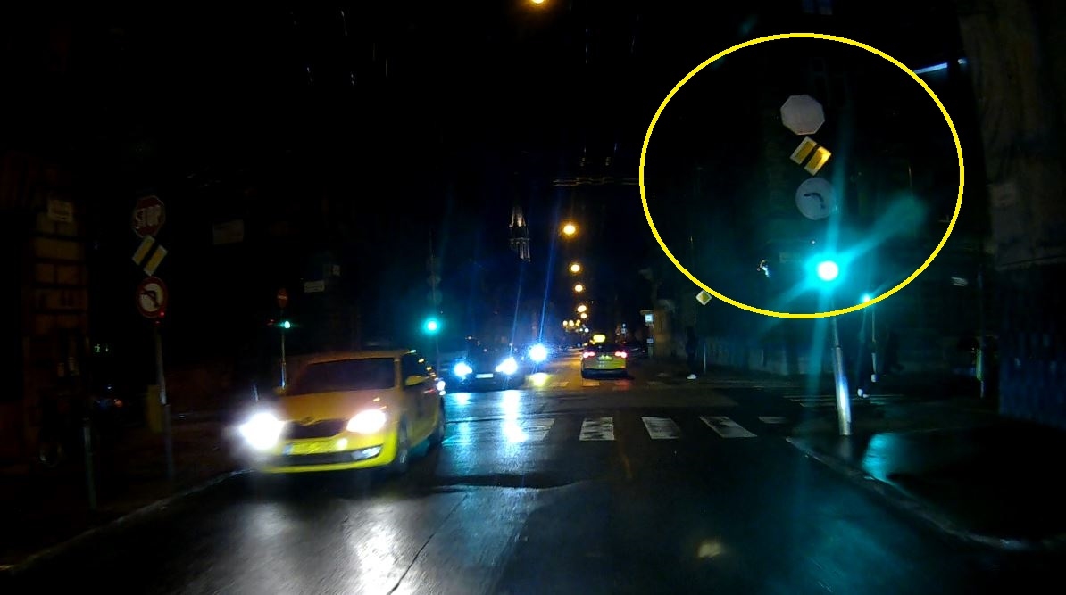 A STOP és a balra kanyarodni tilos táblák kifakultak a Wesselényi-Izabella utca kereszteződésnél.