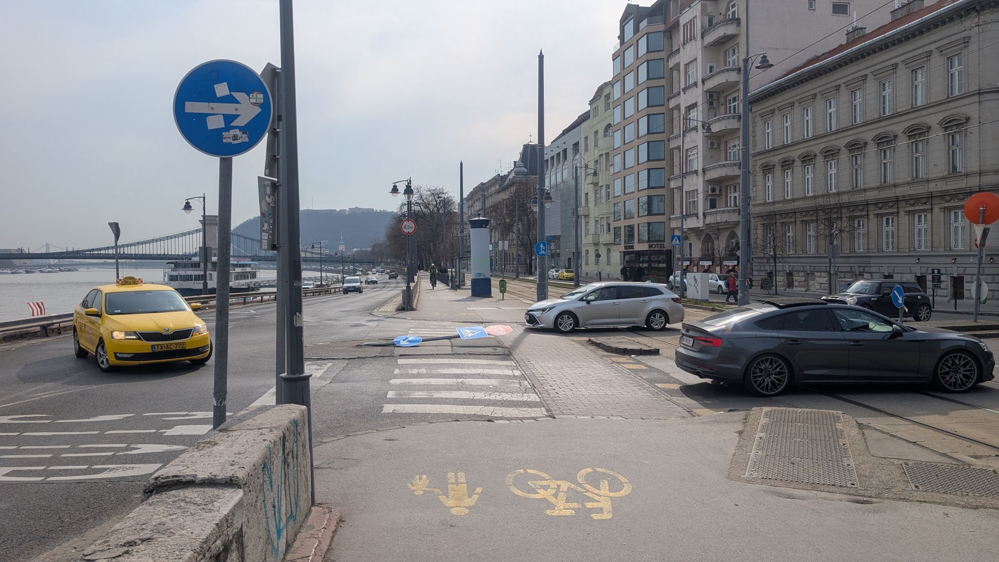 A Halász utca végén a gyalogátkelőnél kidöntöttek egy táblát.