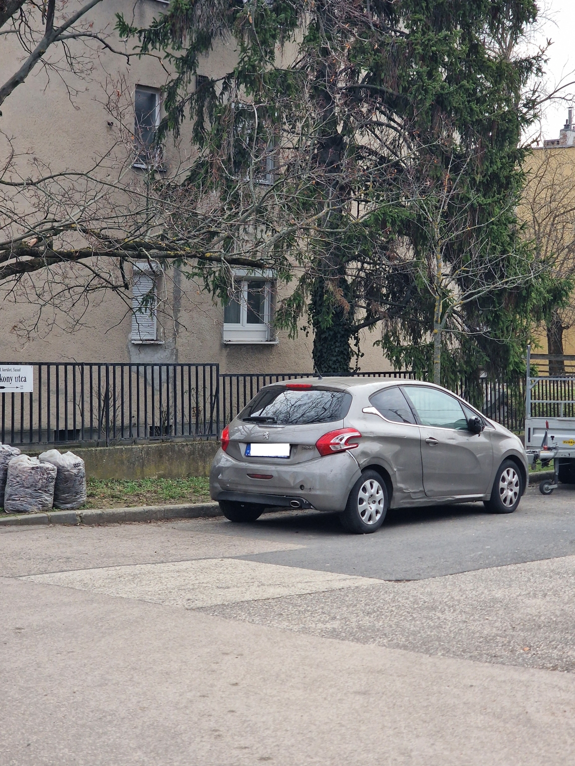 2013-as szürke Peugeot 208 várakozik a Bakony utca 14. előtt. A műszakija 6 éve lejárt, 2020.01.13-ig volt érvényes és össze is van törve.