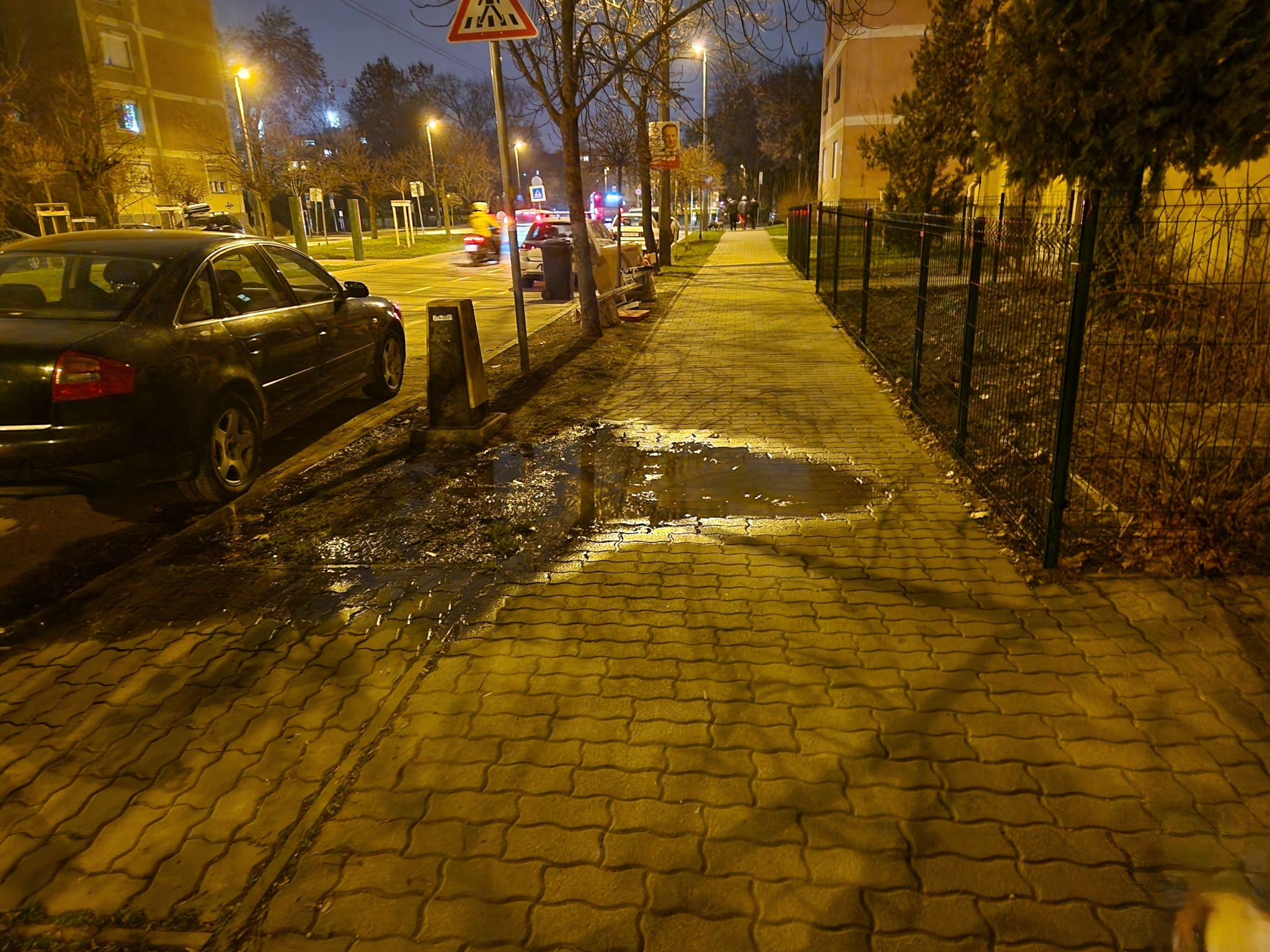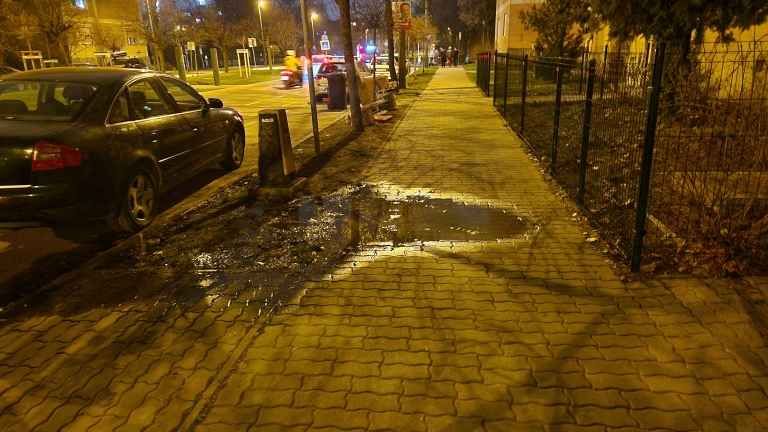 Egy nap is sok, de az egyik ott lakó szerint nem ma merült fel ez a probléma es csak folyik el a víz, kimosva a járda alapját is..