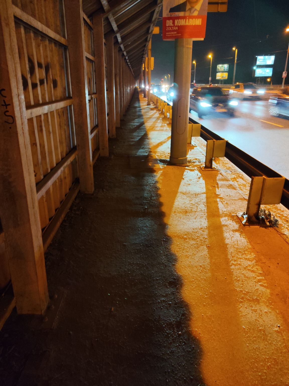 Megint rettenetesen dzsuvás a járda a Róbert Károly körúti felüljárón. Vastagon áll a homok és a felverődött kavics.