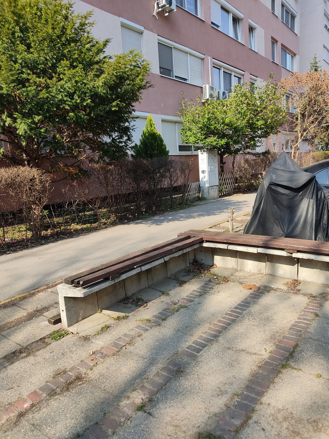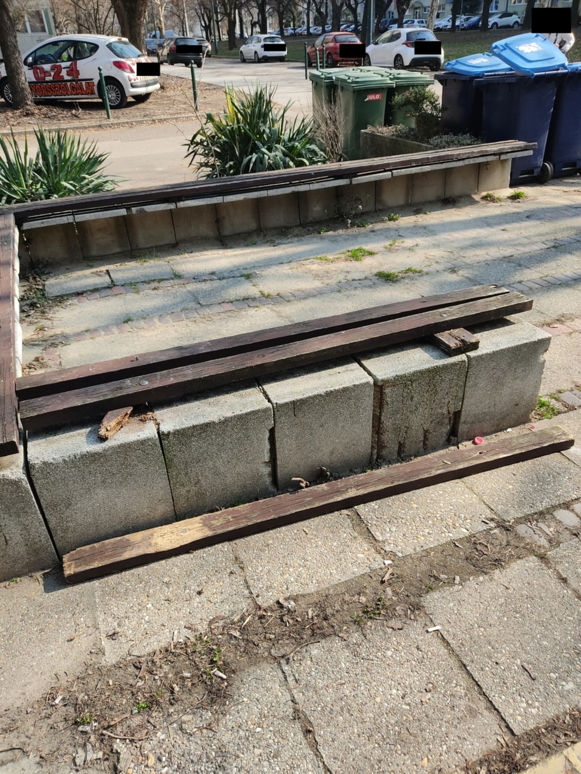 Ond vezér park 2 előtt található ez a törött, veszélyes pad. Szögek csavarok állnak ki belőle. Egyik darabja a földön van már. Szerintem több 10 éves már.