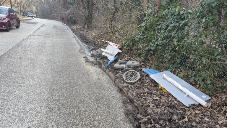Csőtörés gyanús eset, víz tör fel a földből. Az odadobott cuccok alapján a Vízművek volt itt valamikor, de erről nem biztos hogy tudnak.