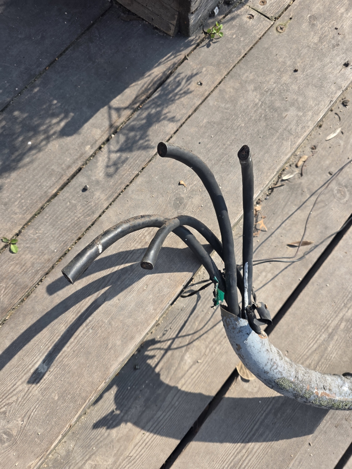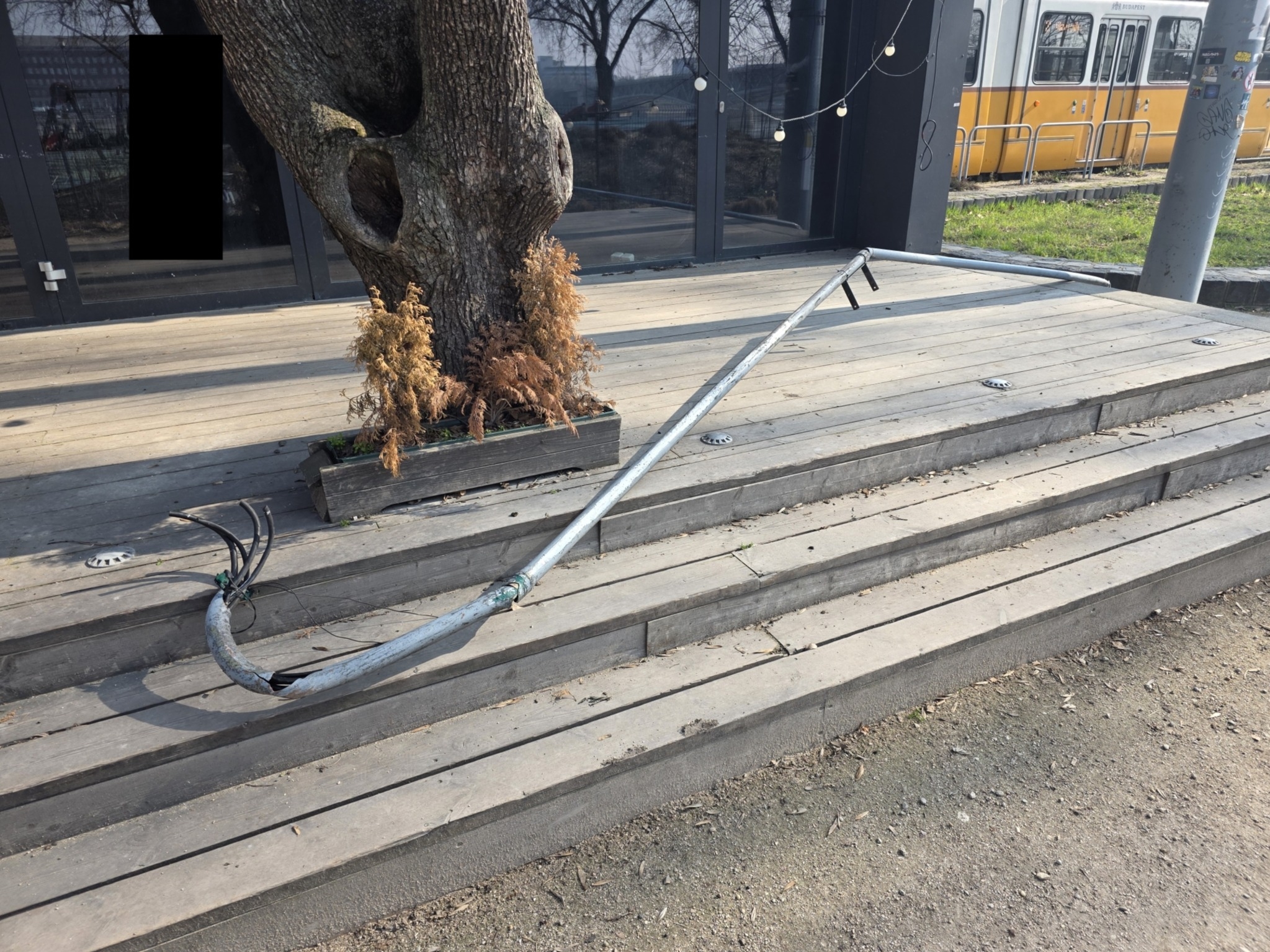 A nehro parton a játszótér és a pavilon bár között a sétáló részre be lóg egy ki döntött oszlop több elektromos vezeték zárás nélkül lóg ki belőle.