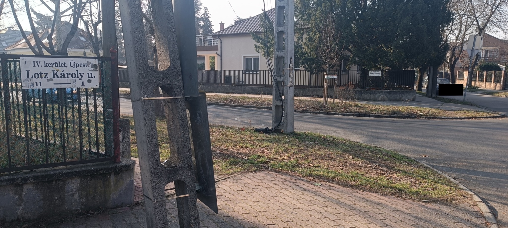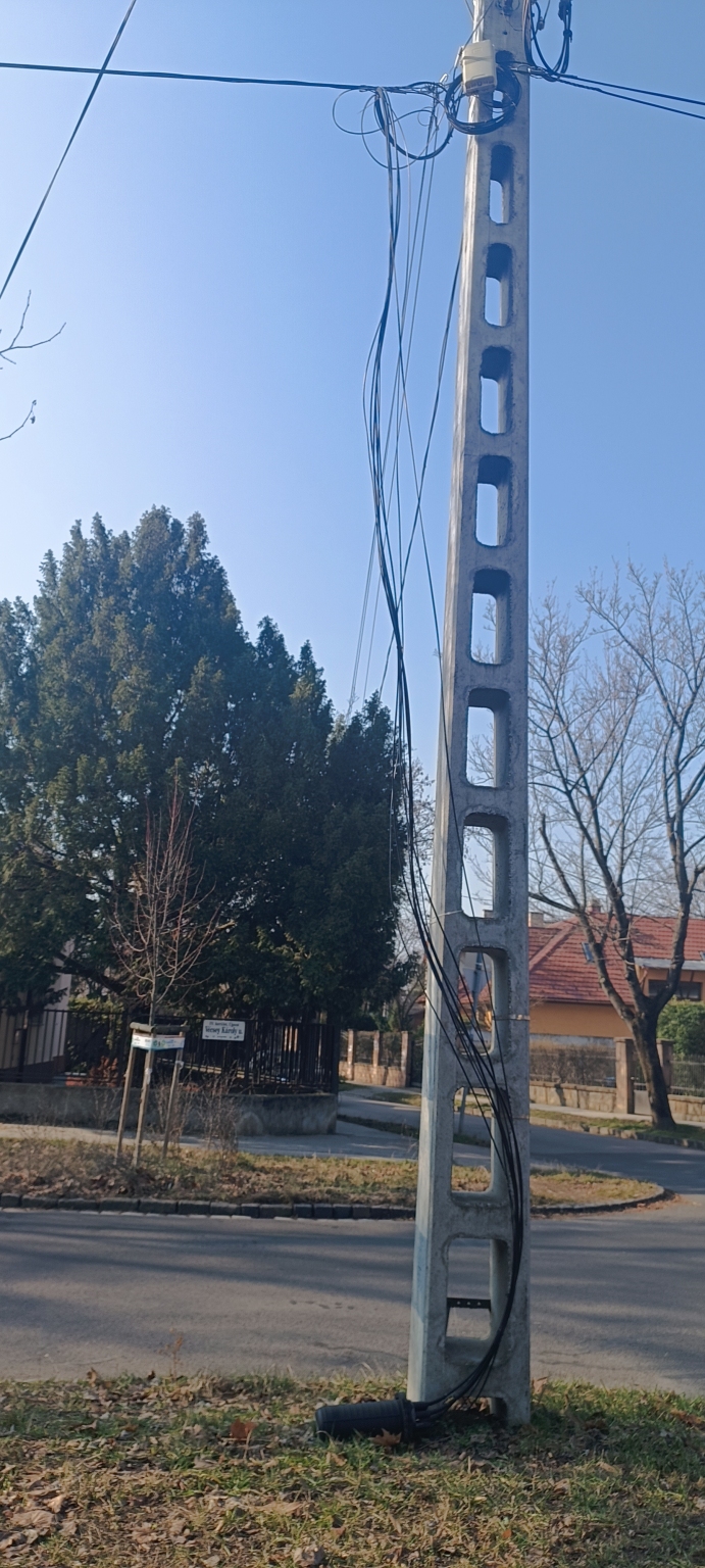 A villany (lámpa) oszlopról egy fekete hengeres tárgy lóg le, amiből kábelek jönnek ki és mennek az oszlop tetejére. Valószínűleg a berendezés csak leesett, látszólag nem sérült és a kábelek sem. Gr. Esterházy János tér oldalán, a park mellett utcasarkon.