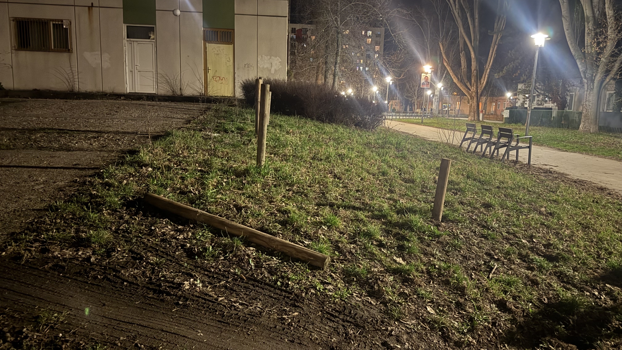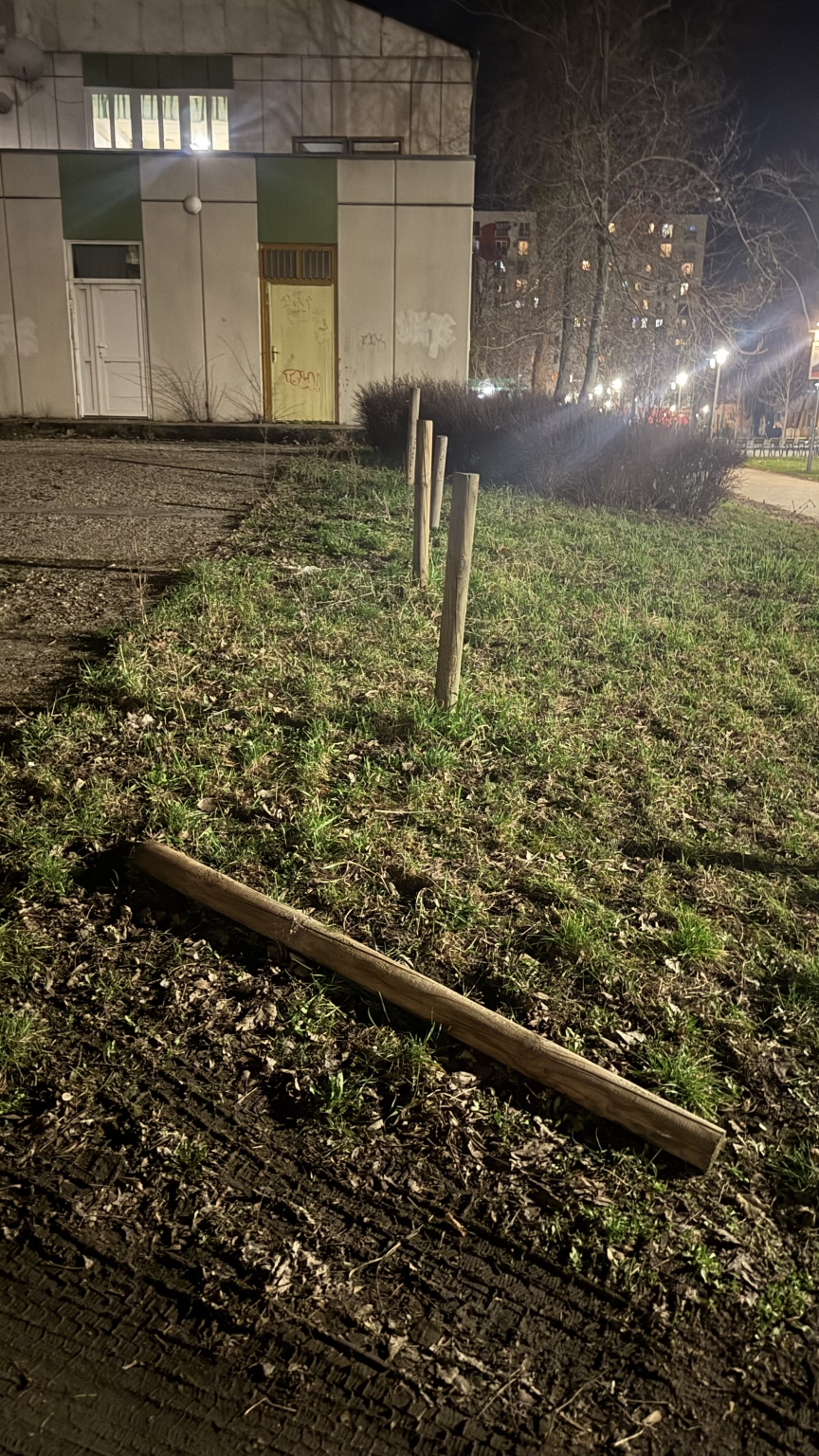 A fa oszlop nincs a helyén és autók járnak át látva a nyomokat.