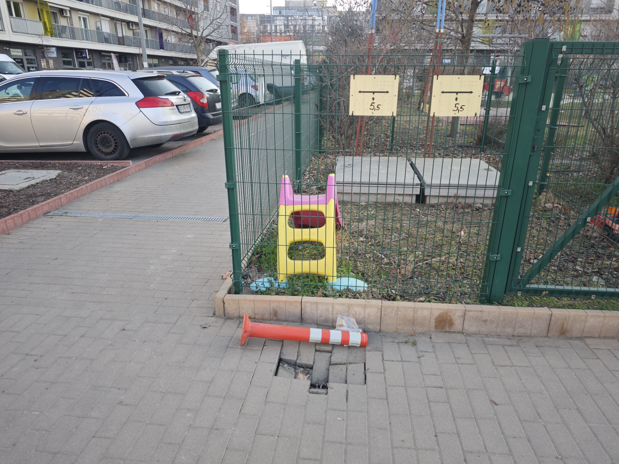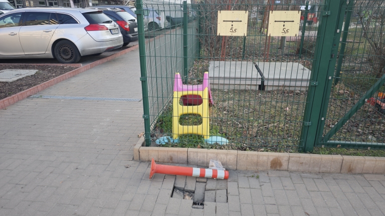 A ferencvárosi Nádasdy utcában, a City Home lakóparkban, az utca közterületi részén beszakadt a díszborítás, balesetveszélyessé téve a gyalogosközlekedést. Mivel egy játszótér közvetlen közelében van, sok a kisgyerekes, babakocsis, rolleres, görkoris közlekedő, akik nem tudják feltétlenül időben észrevenni a hibát