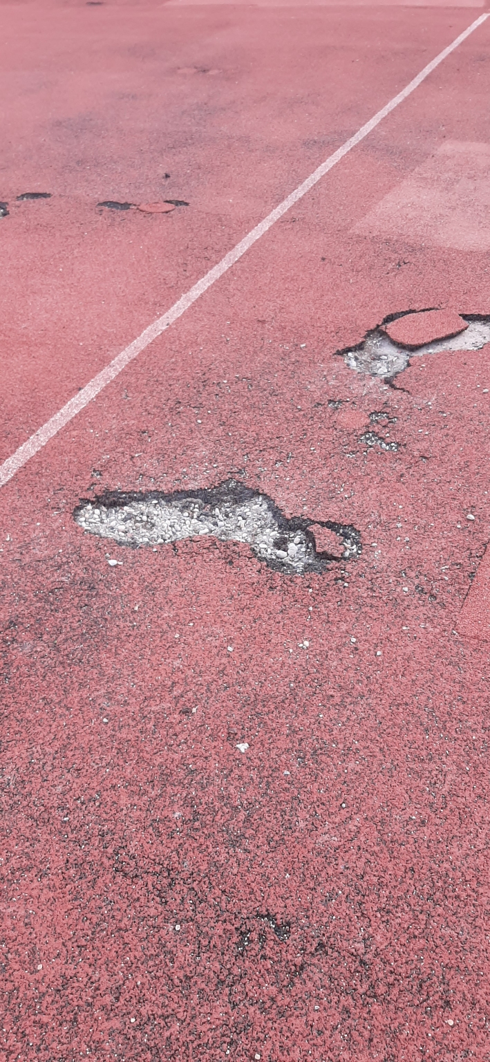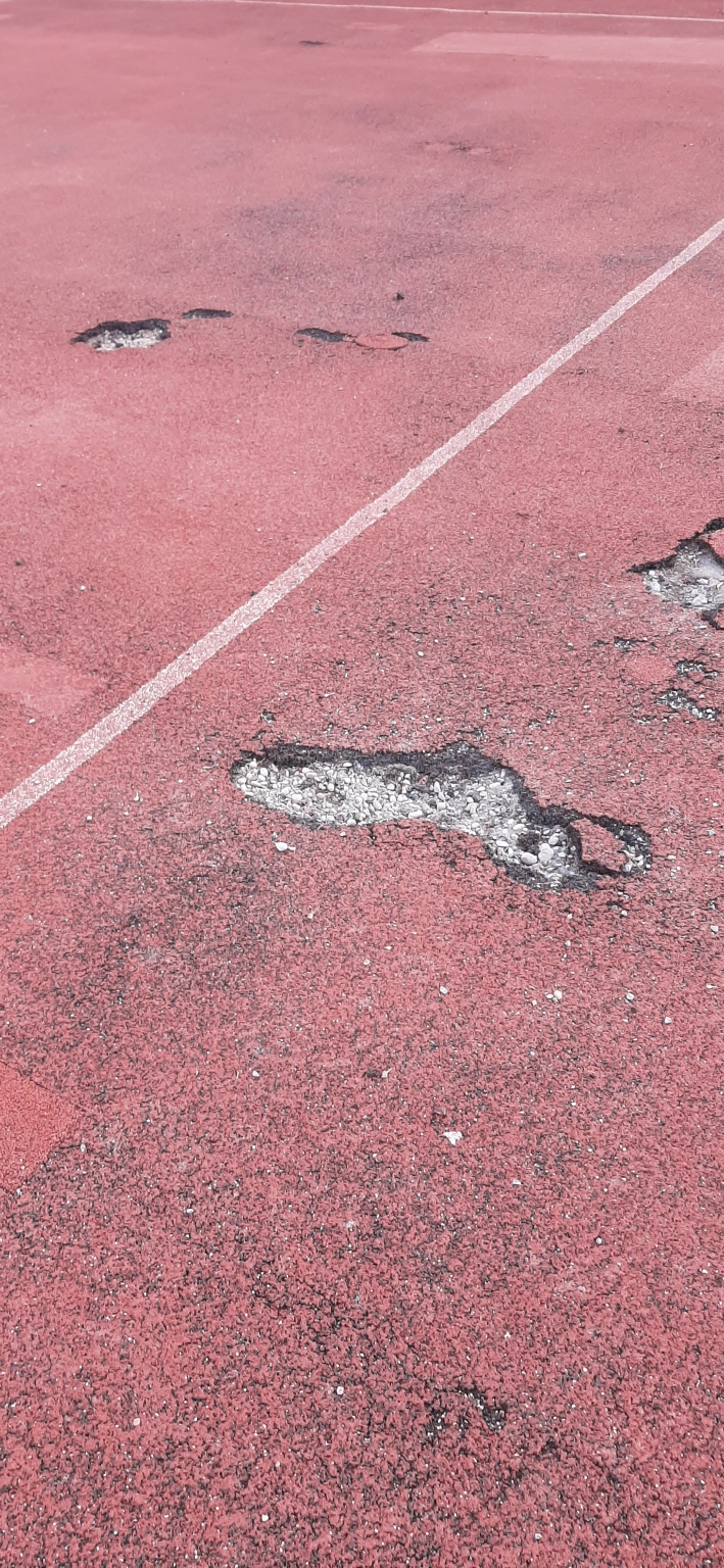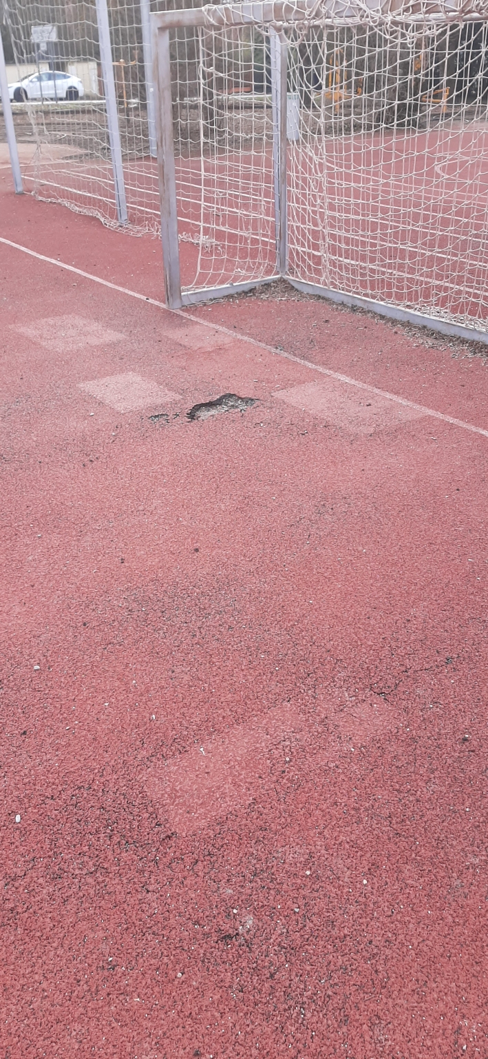 Budapest, Ady Ligeten a játszótéren a foci pályán a focikapu előtt a burkolatot a tél megrongálta.
