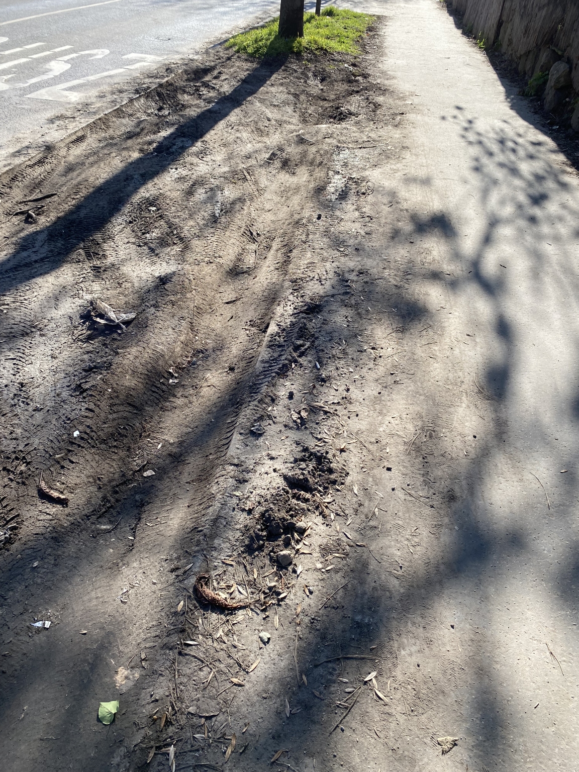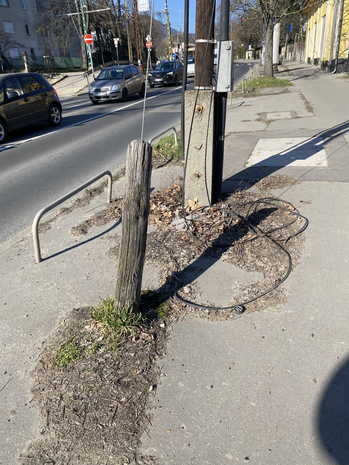 A Hűvösvölgyi út elején, a Hűvösvölgyi út és a Budakeszi út találkozásánál a járda és a zöldterületek állapota régóta rendezetlen és elhanyagolt. A járda mentén a parkolósáv sáros, a járda széle tele van felhalmozódott hordalékkal és láthatóan hosszú ideje nincs takarítva. A csomópontnál található zöldterület szintén elhanyagolt állapotban van, a terület gondozatlan, a mellékelt fotók alapján jó ideje nem történt érdemi takarítás. Az egyik oszlop körül ráadásul egy szabadon heverő kábel is látható, ami rendezetlen és potenciálisan balesetveszélyes. Kérem a terület kitakarítását, a zöldterületek rendezését, valamint a kábel biztonságos rögzítését vagy eltávolítását.
