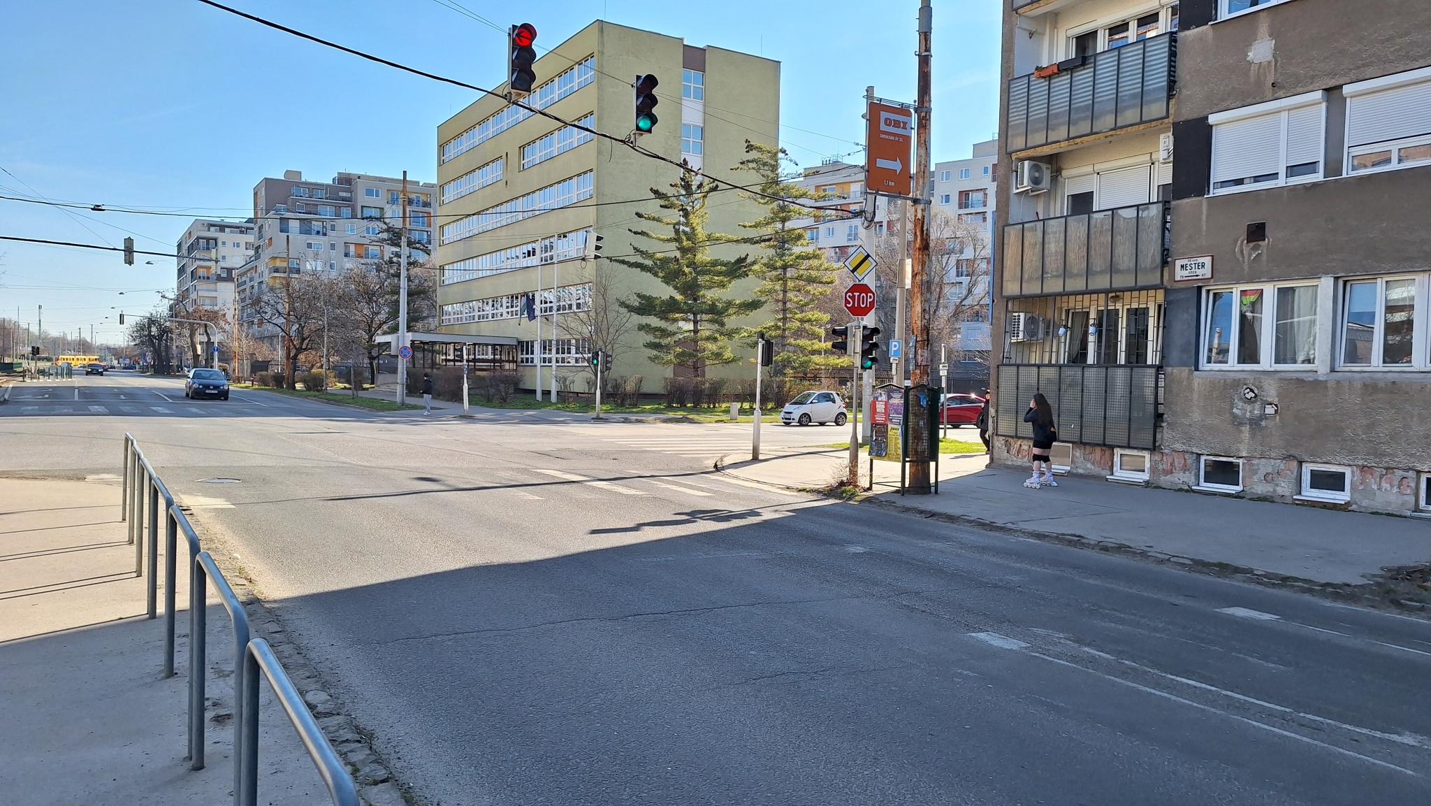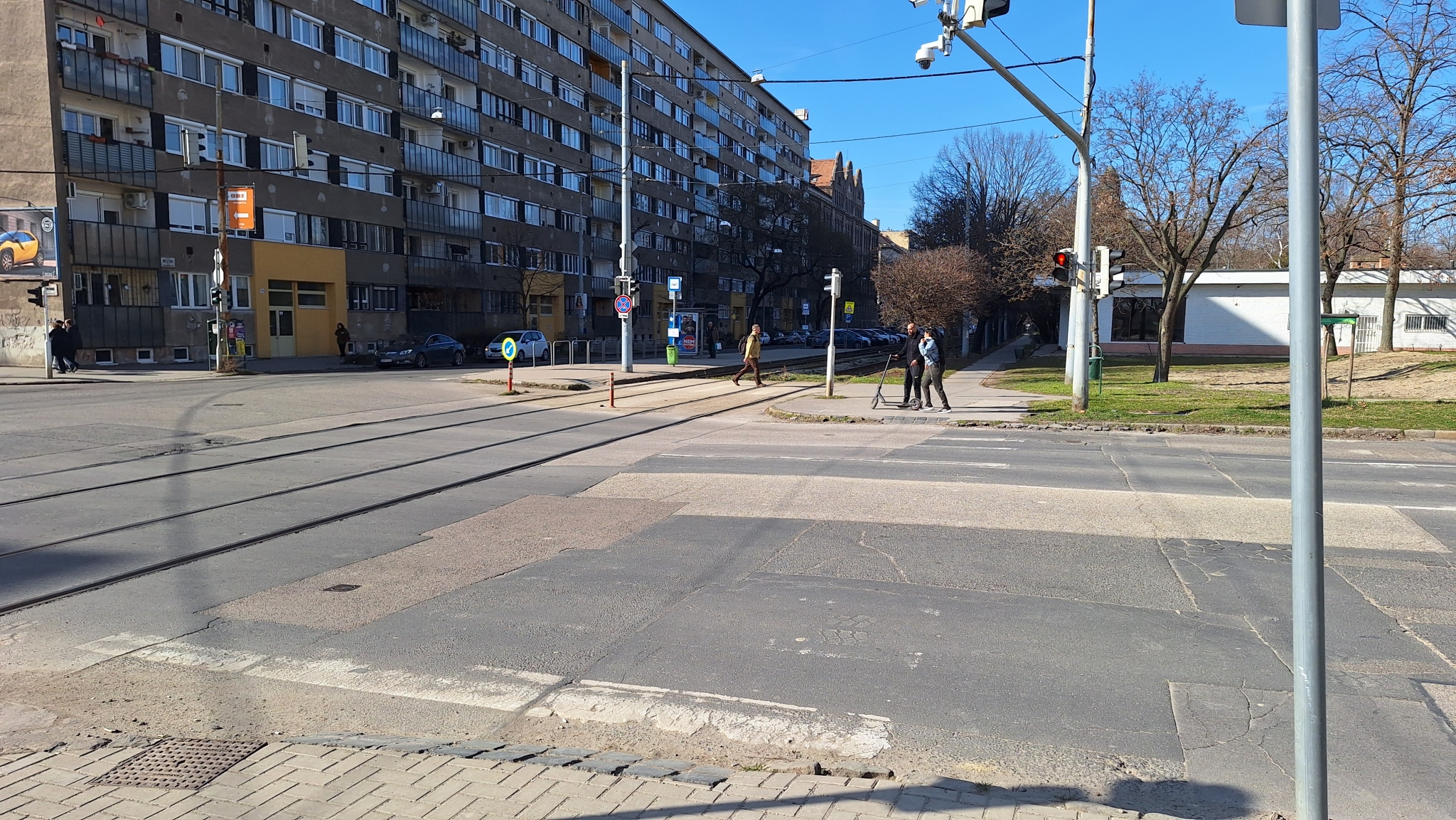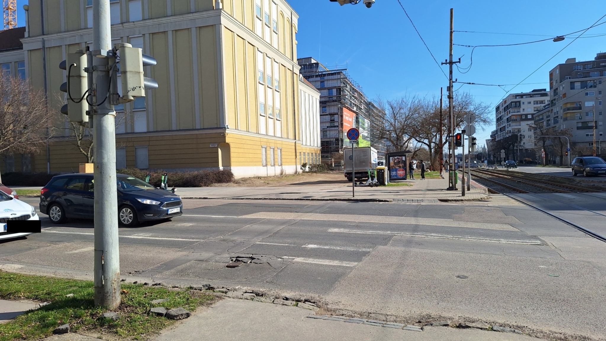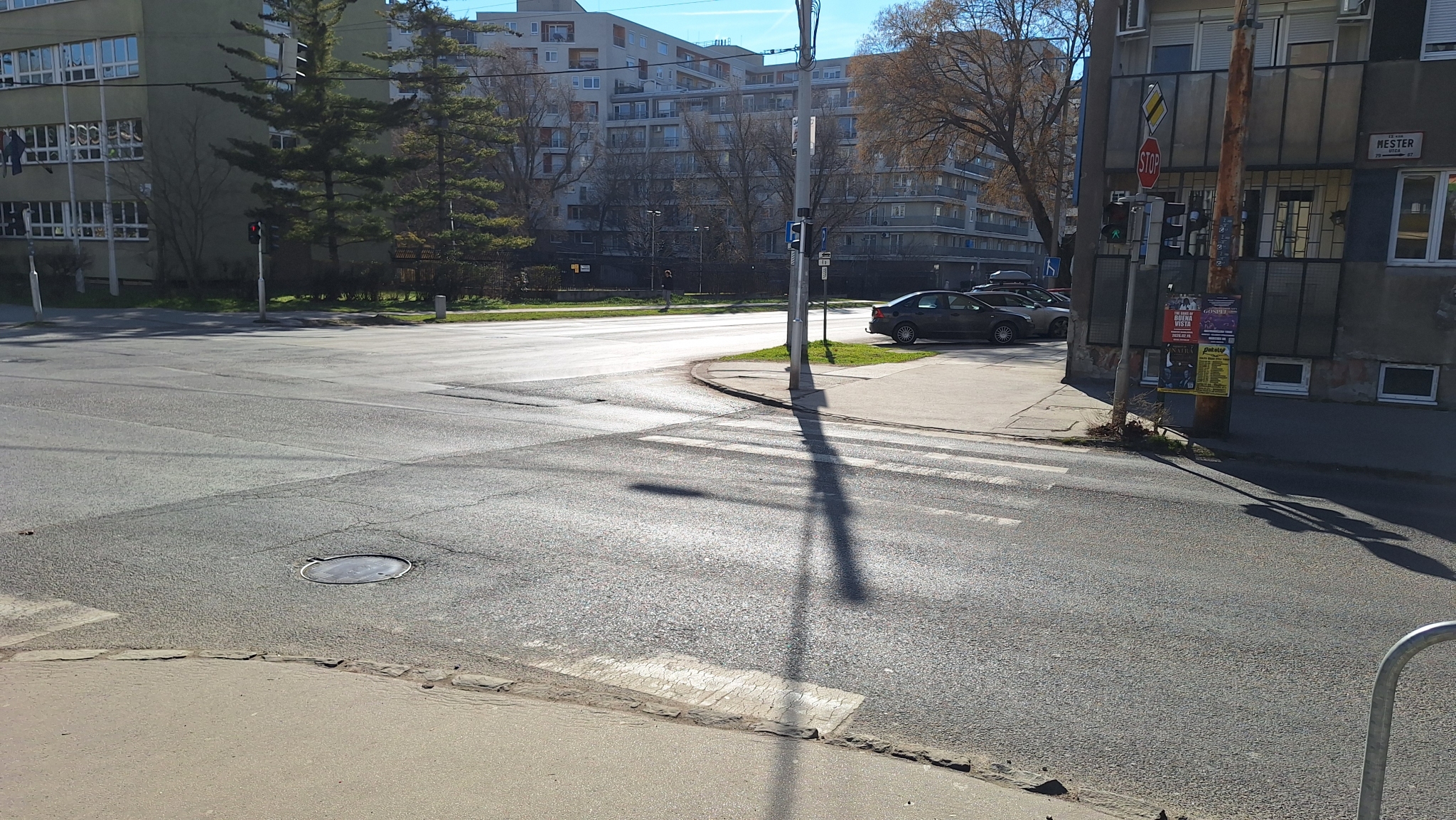 A Mester és Vágóhíd utca kereszteződésénél valamennyi útburkolati jel újrafestésre szorul.