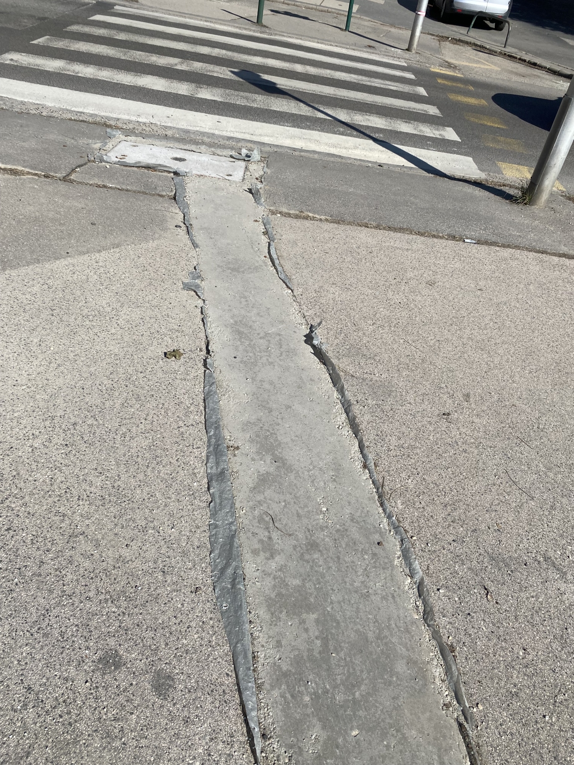 A gyalogátkelőnél egy korábbi munkavégzés után a betonburkolat rendkívül igénytelen állapotban maradt. A javított sáv szélein fólia jellegű elválasztó anyagok állnak ki a betonból, amelyek láthatóan nem kerültek levágásra vagy megfelelően eltávolításra a munka befejezésekor. Ki és milyen ellenőrzés mellett vette át ezt a munkát ebben az állapotban?