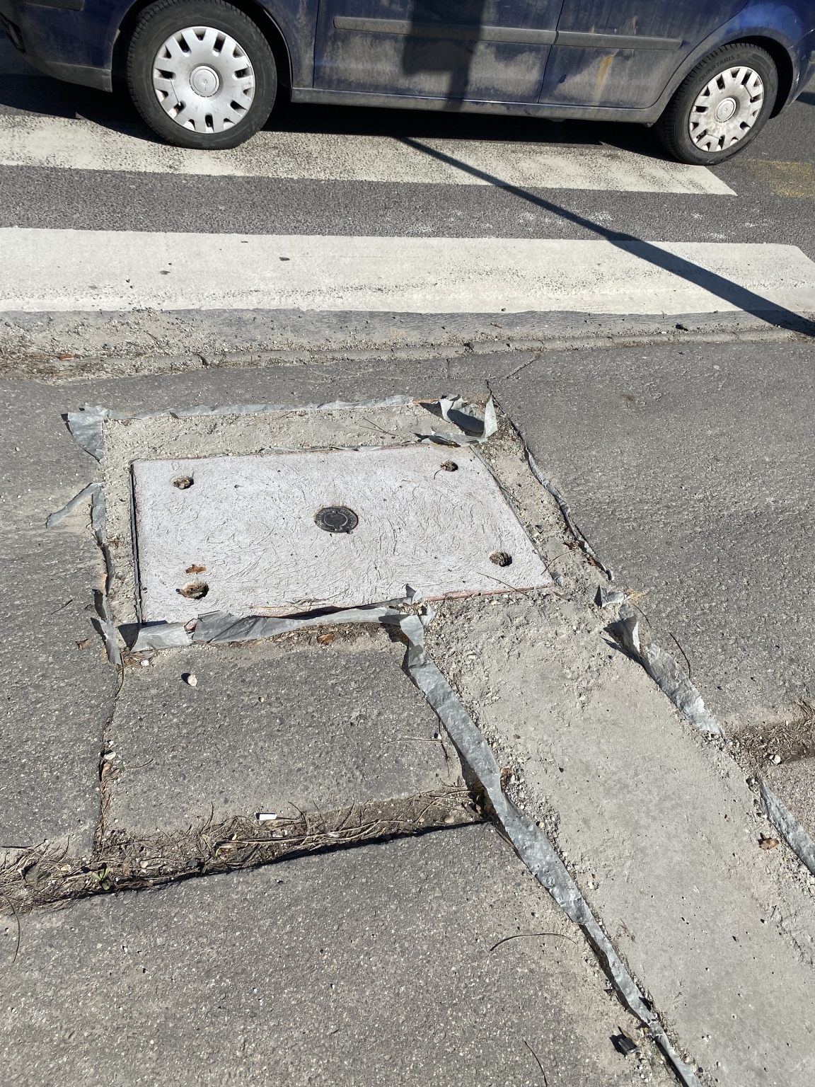 Szakszerűtlen burkolatjavítás a gyalogátkelőnél