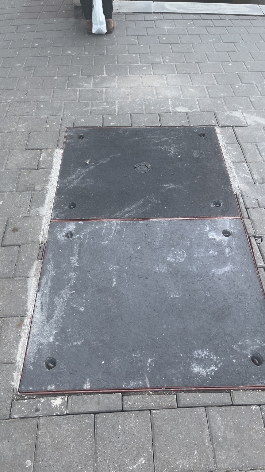 A Deák Ferenc téren, az aluljáró ‘D’ jelű kijárata előtt található dupla fedlapjuk sarka kilóg a földből, ezért botlásveszélyes, valamint a kopófelülete is hiányos. Kérem, a csere során lehetőleg a járdáéval megegyező burkolattal lássák el a fedlapokat.