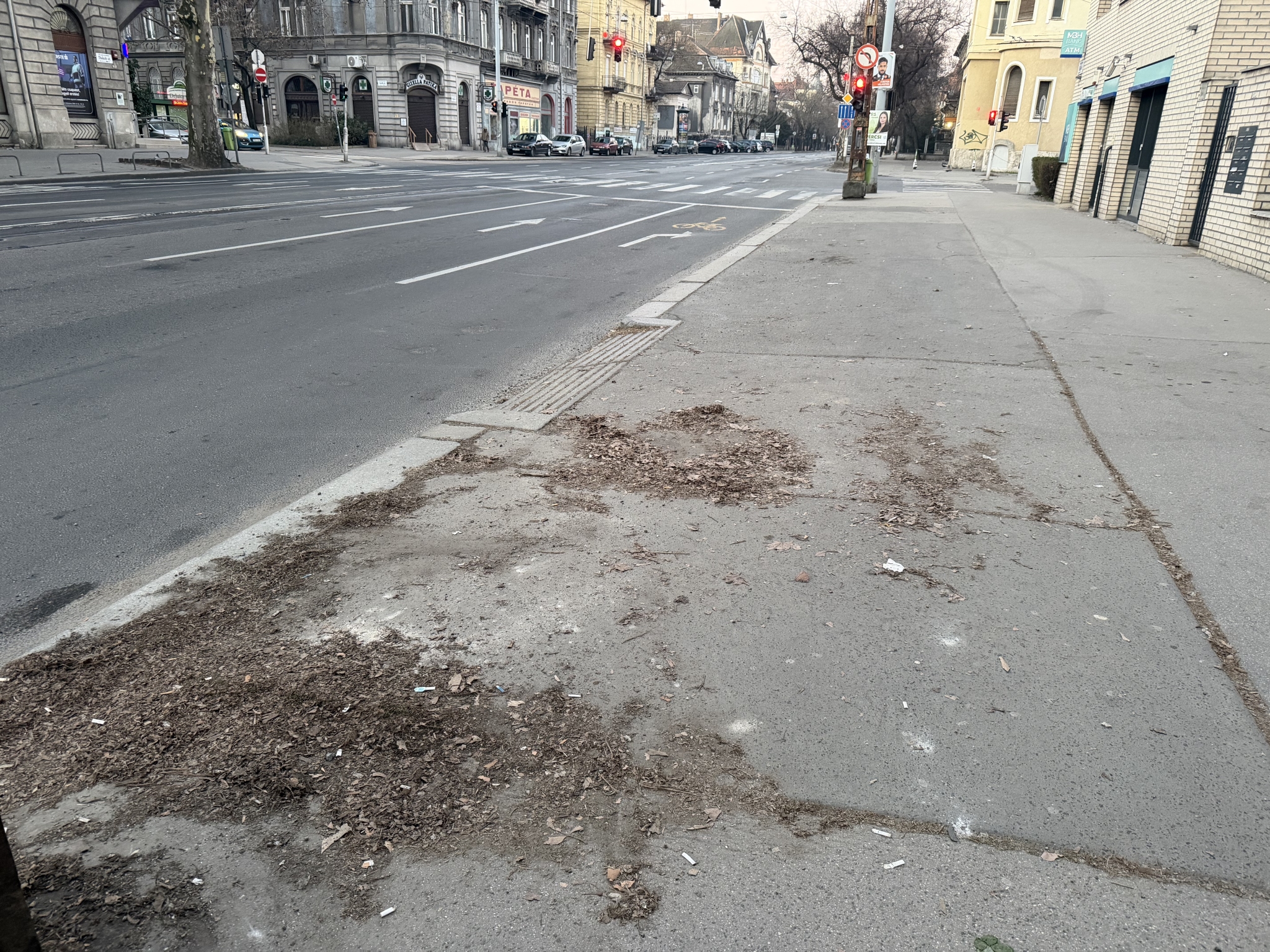A Thököly úton, a Hungária körútról a Hermina út felé menve a járda piszkos, tele van hulladékkal, régi falevelekkel tavalyról. A járda állapota rettenetes, repedezett, göröngyös, lukak vannak rajta. A nem látó emberek itt jönnének haza a vonattól az intézethez, a bankba. Kinek a dolga? Tessenek rendbetenni!