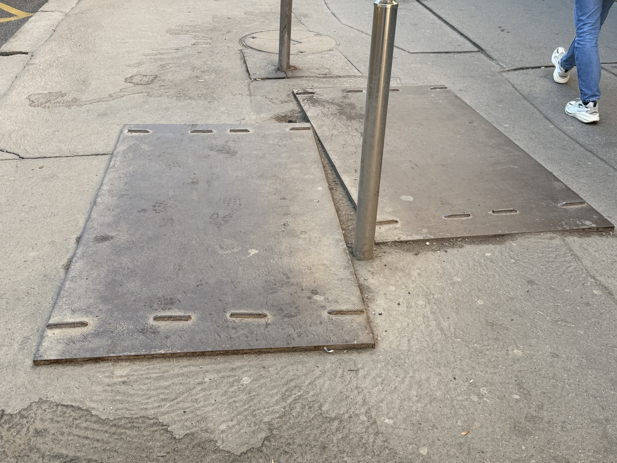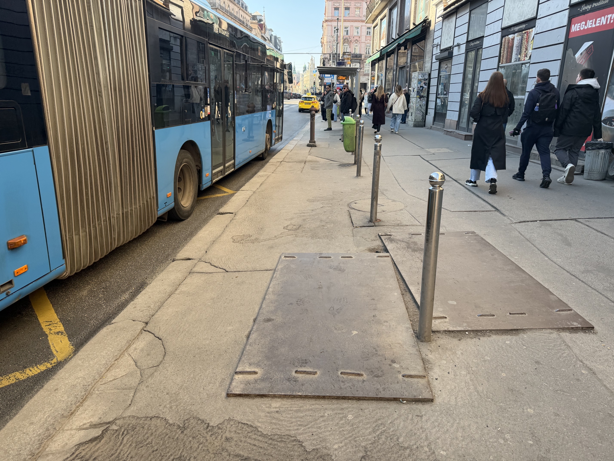 A Rákóczi úton, az Astoria megállónál kettő nagy vaslap ott van régóta hagyva a járdán. Jól meg lehet benne botlani. Vigyék el, ne legyen ott.