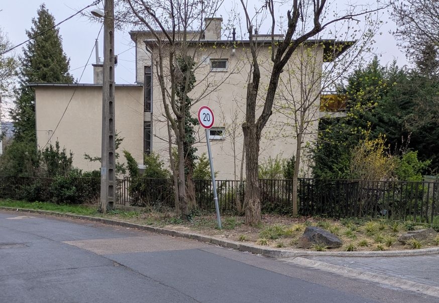 Az egyik tábla útszűkületet és építkezést jelül, ami nincs a környéken. A másik tábla nemsokkal odább 20km/h sebesség korlátozást ír elő, aminek nem látom az indokát.