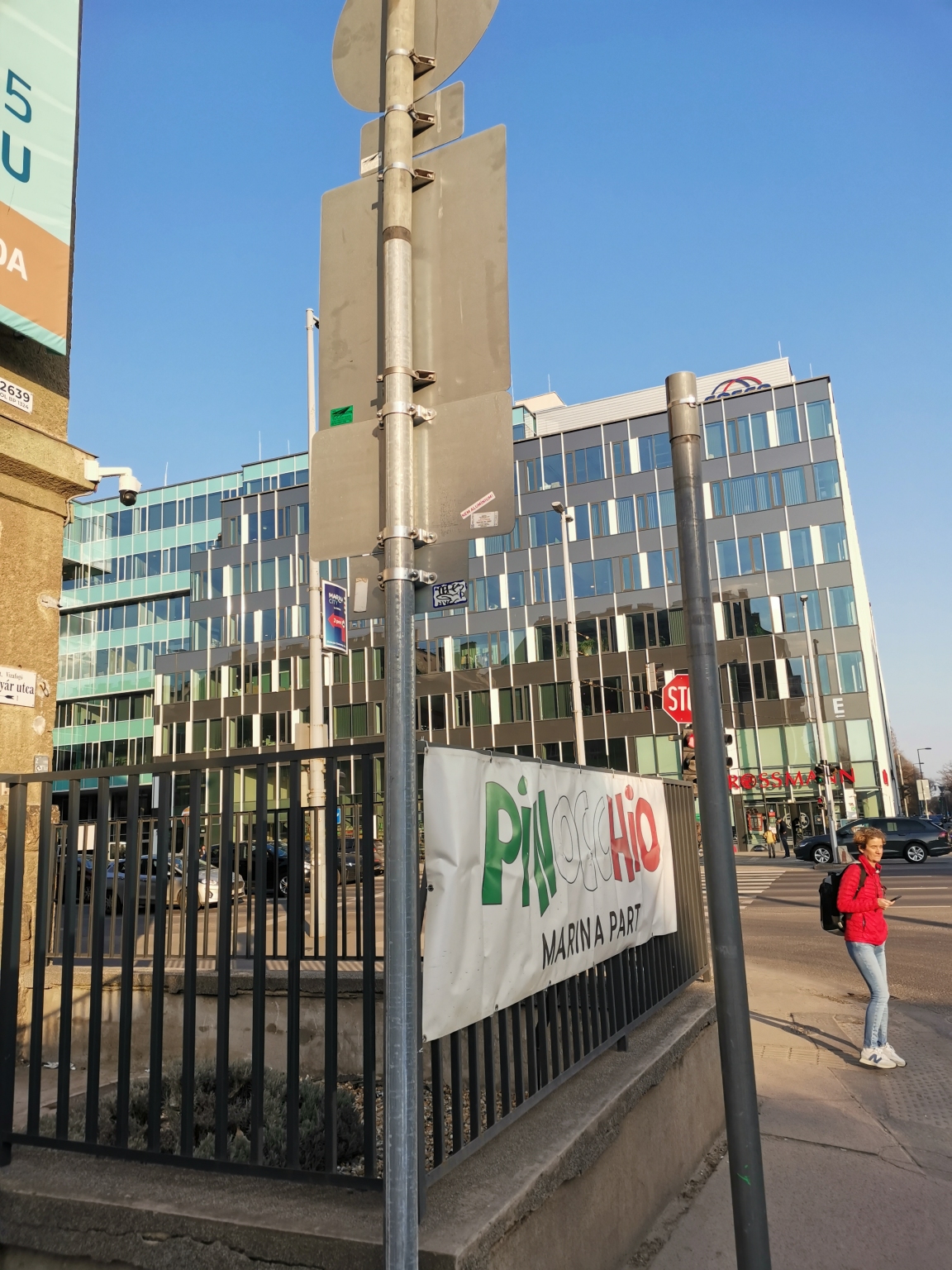 Járda közepén álló, használaton kívüli oszlop. Az oszlop miatt nagyon nehezen lehet elférni a járdán. A gyerekkocsival közlekedők az úttest felőli oldalra kényszerülnek, ahol viszont a kanyarodó járművekhez kerülnek közel. Ráadásul a járda erősen lejt az úttest felé. Az oszlop a Csavargyár utca legelején a Váci úti saroknál van.